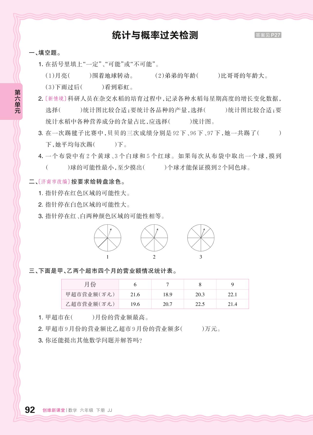2024春下册六年级数学冀教版 第六单元 回顾与整理——统计与概率过关检测