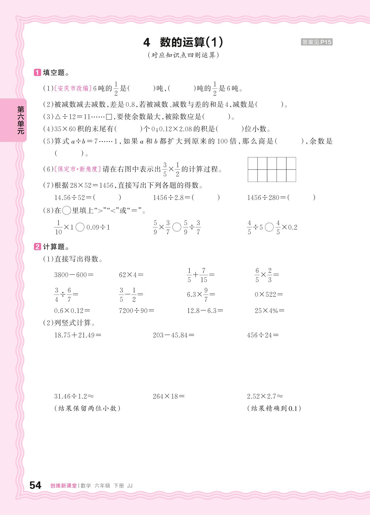 2024春下册六年级数学冀教版 第六单元 回顾与整理(数与代数)——4. 数的运算(1)