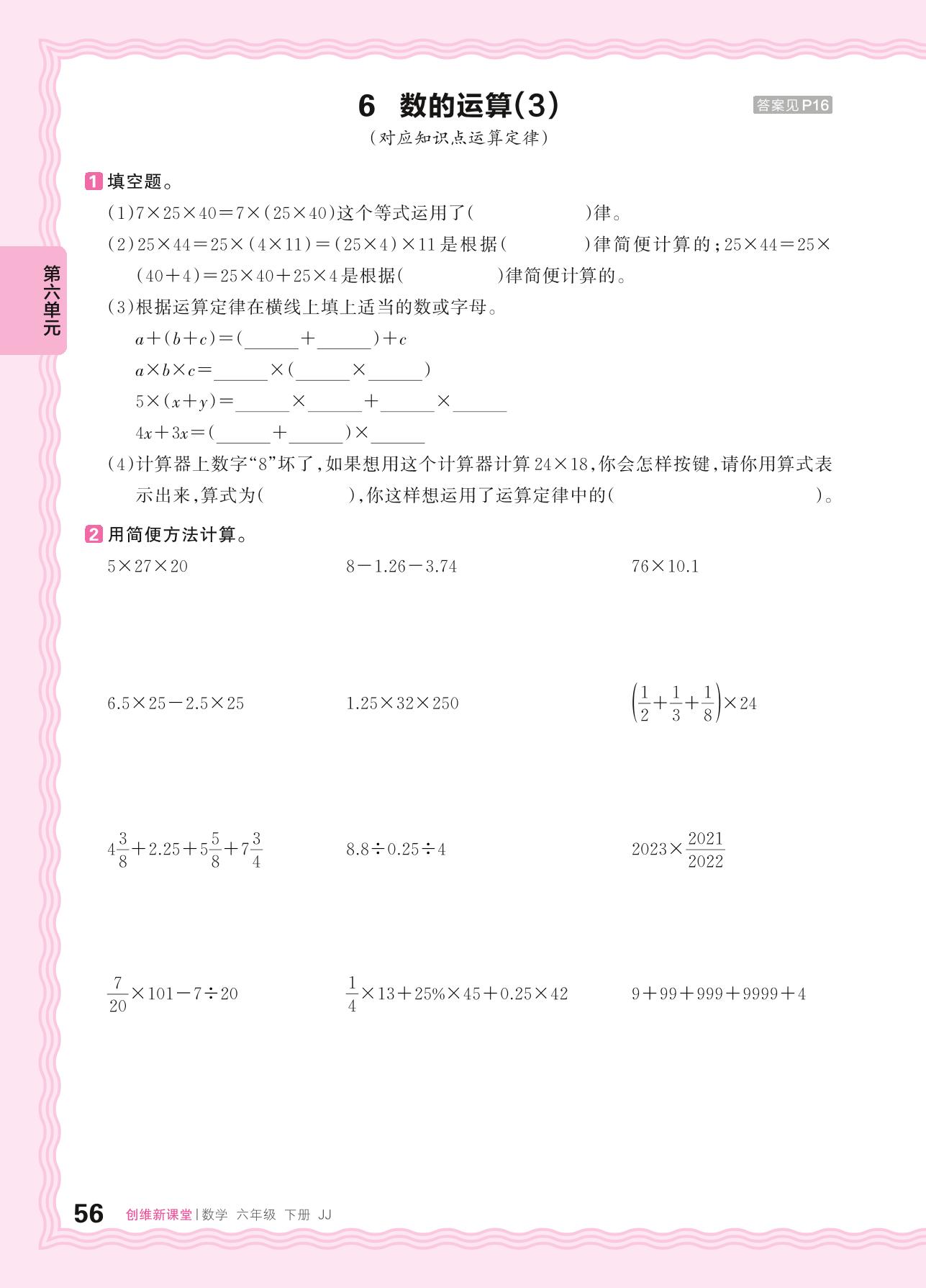 2024春下册六年级数学冀教版 第六单元 回顾与整理(数与代数)——6. 数的运算(3)