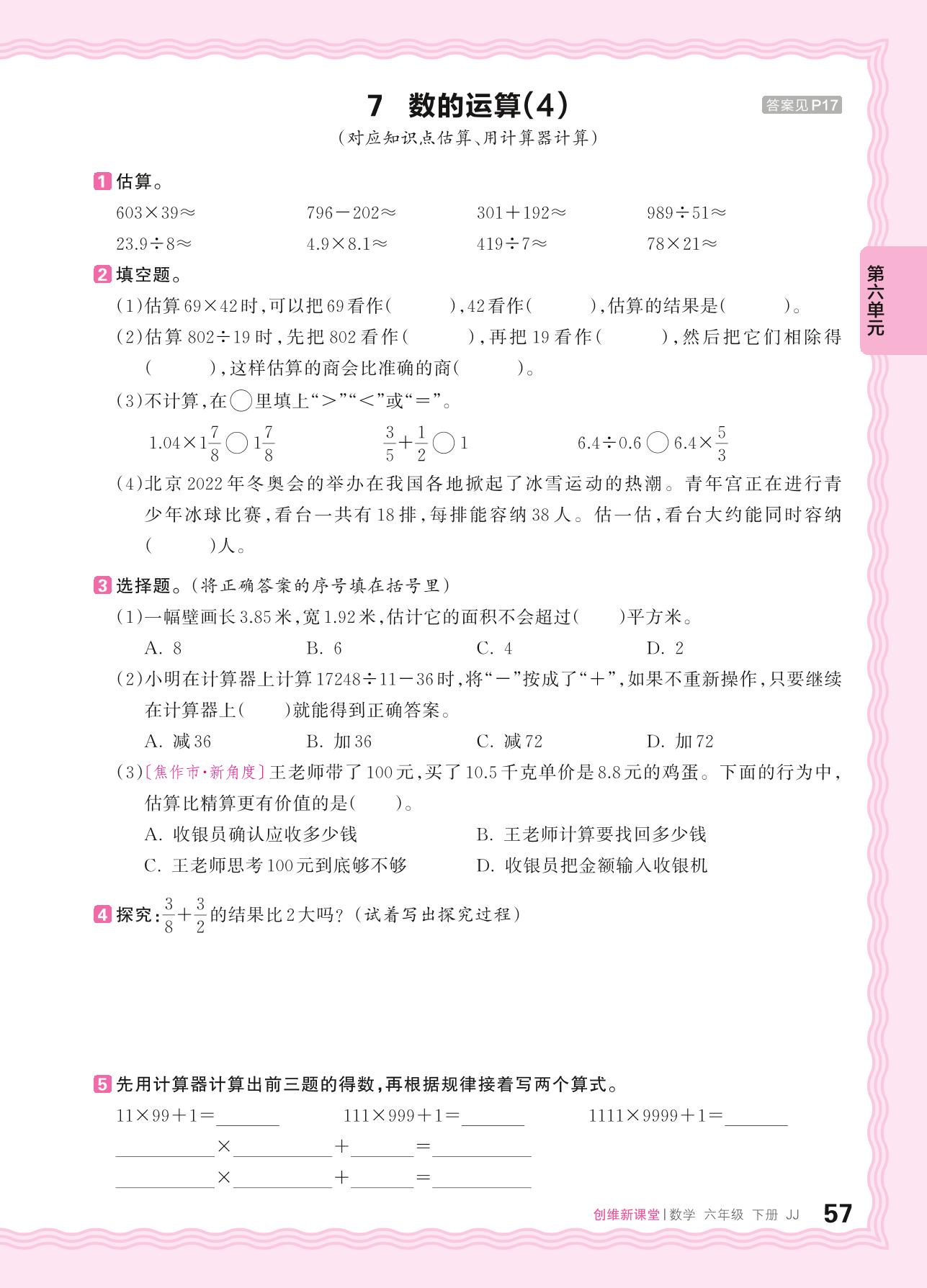 2024春下册六年级数学冀教版 第六单元 回顾与整理(数与代数)——7. 数的运算(4)