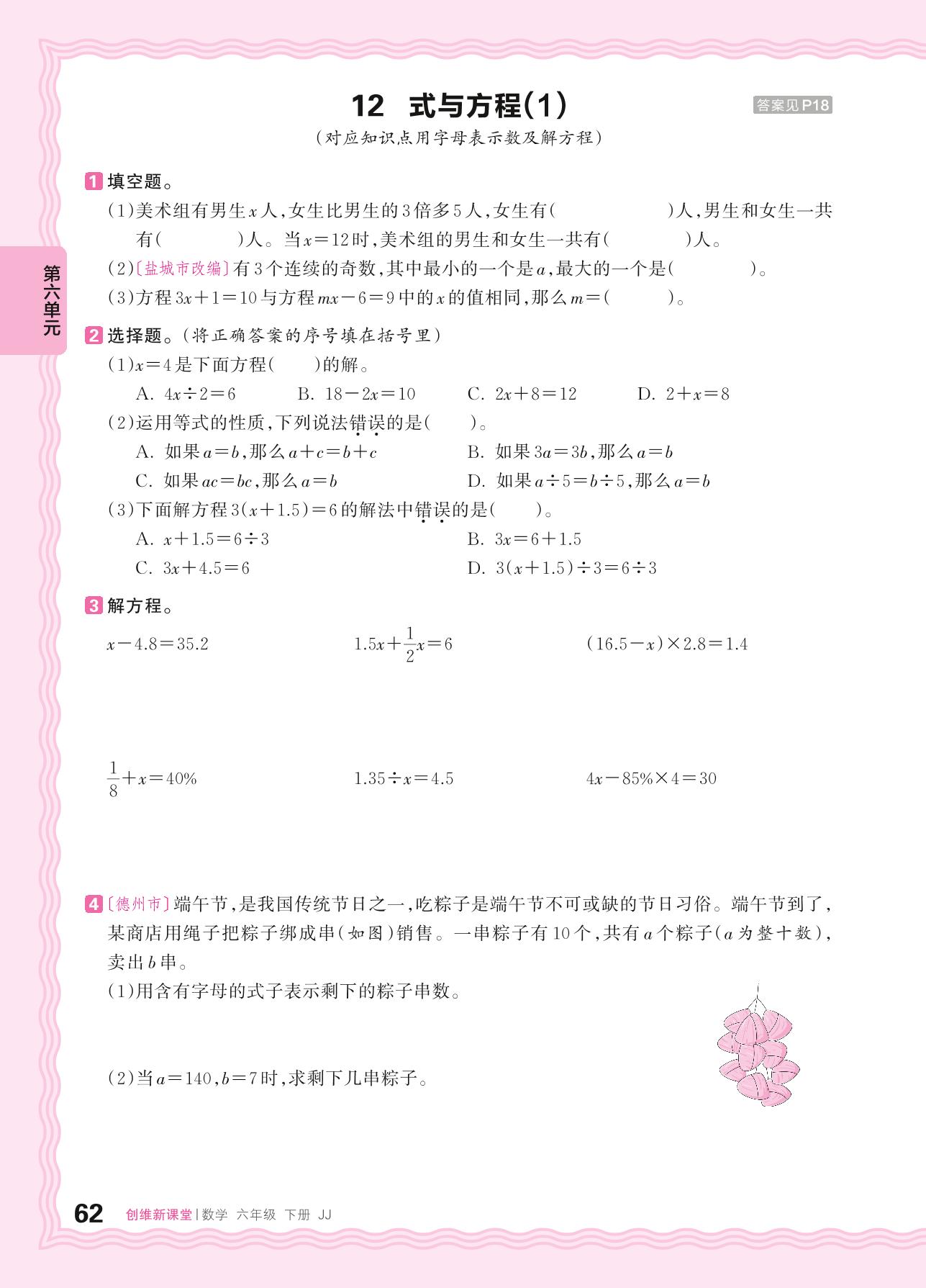 2024春下册六年级数学冀教版 第六单元 回顾与整理(数与代数)——12. 式与方程(1)