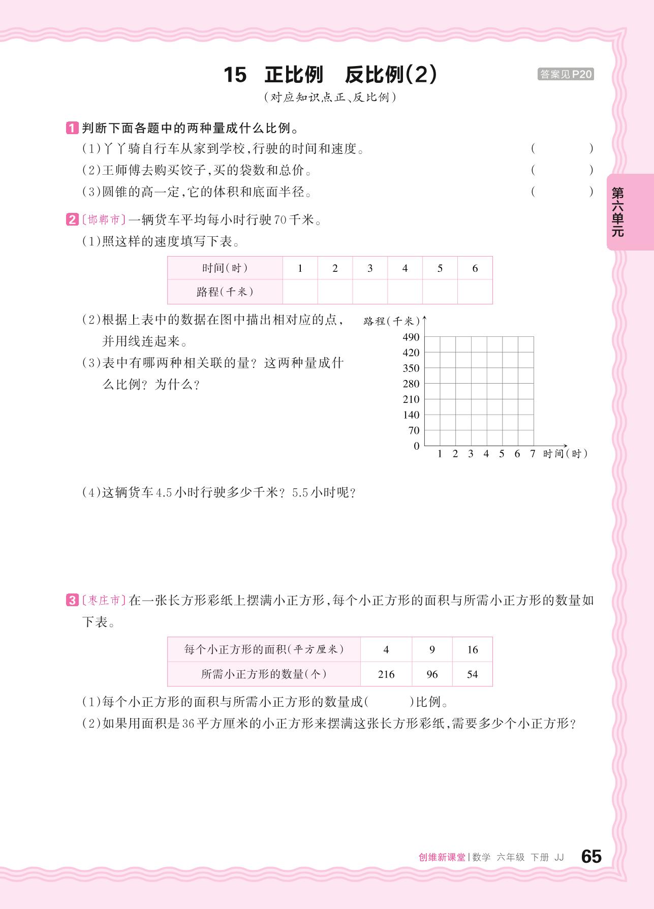 2024春下册六年级数学冀教版 第六单元 回顾与整理(数与代数)——15. 正比例 反比例(2)