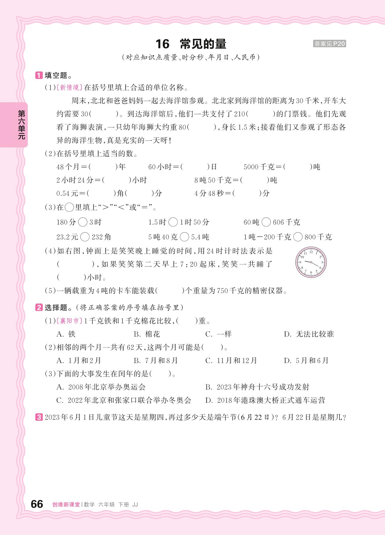 2024春下册六年级数学冀教版 第六单元 回顾与整理(数与代数)——16. 常见的量