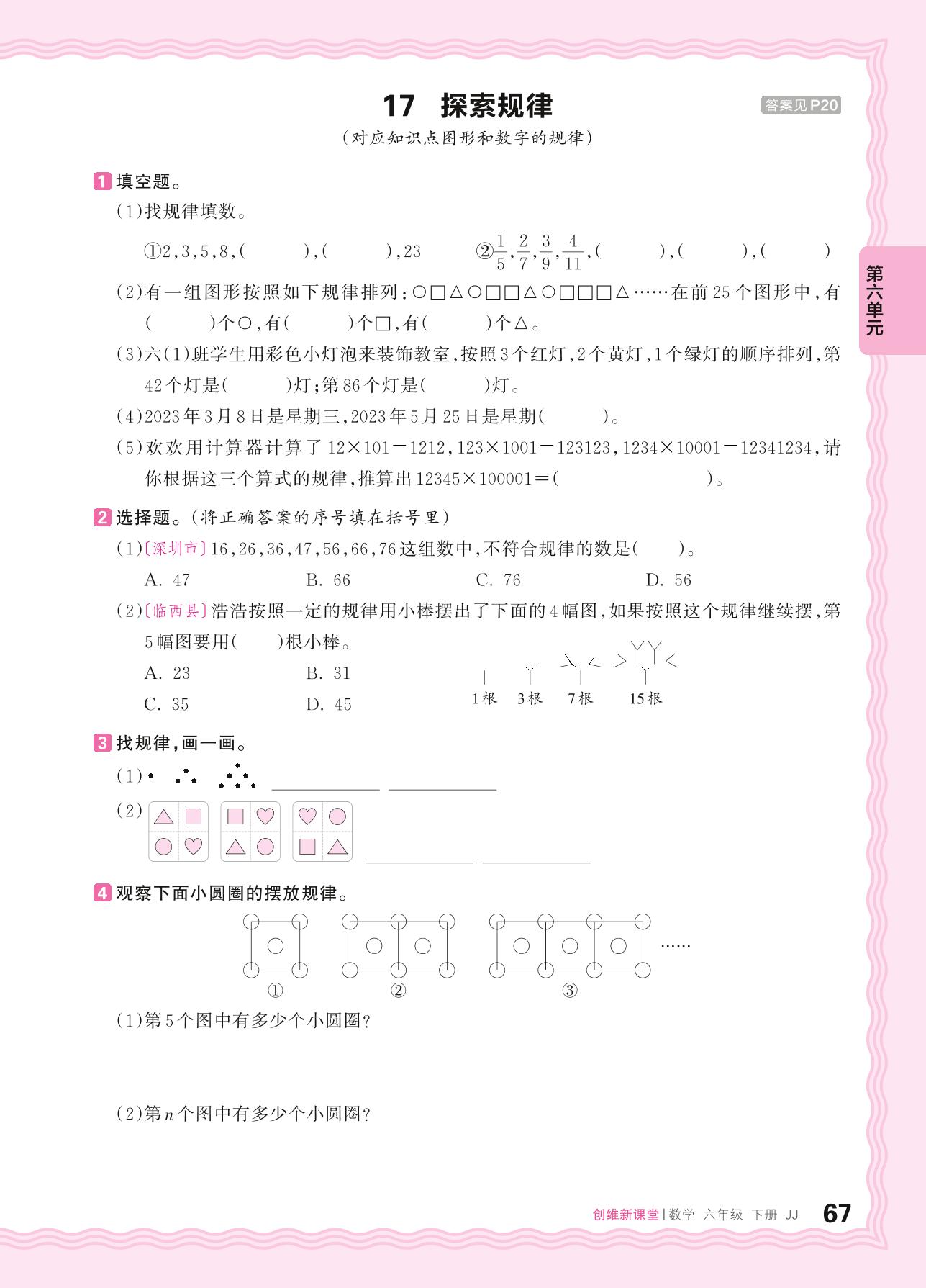 2024春下册六年级数学冀教版 第六单元 回顾与整理(数与代数)——17. 探索规律