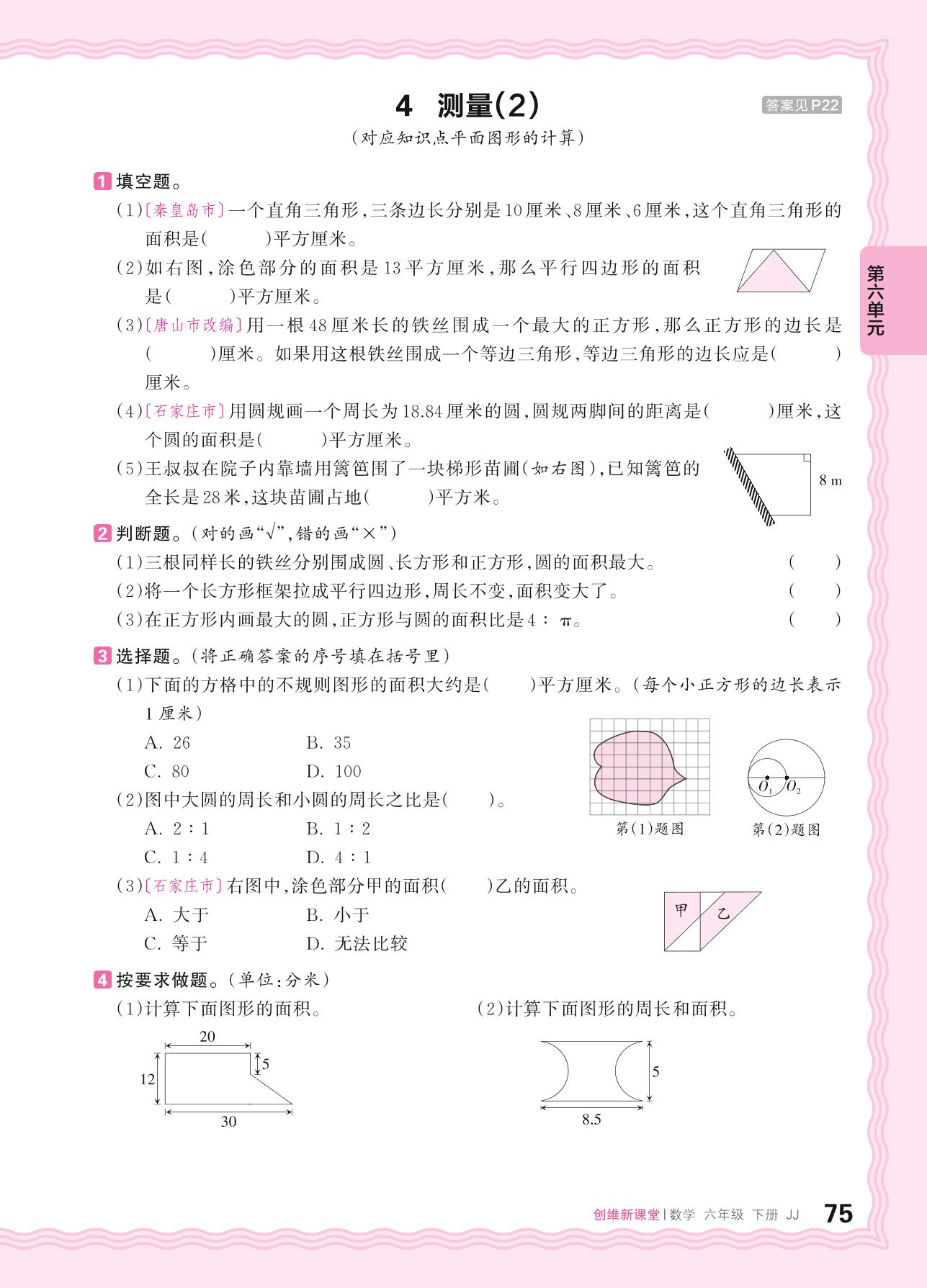 2024春下册六年级数学冀教版 第六单元 回顾与整理(图形与几何)——4. 测量(2)