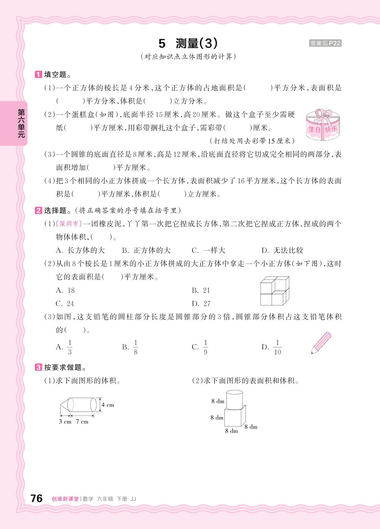 2024春下册六年级数学冀教版 第六单元 回顾与整理(图形与几何)——5. 测量(3)