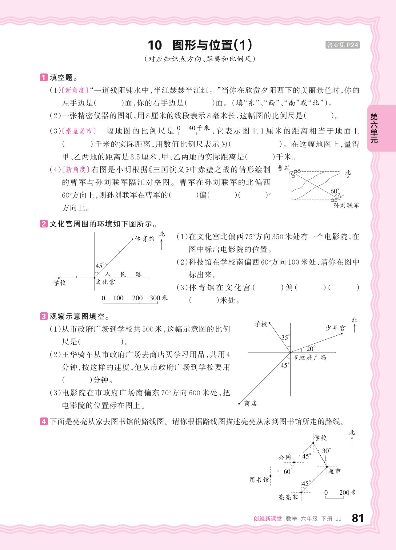 2024春下册六年级数学冀教版 第六单元 回顾与整理(图形与几何)——10. 图形与位置(1)