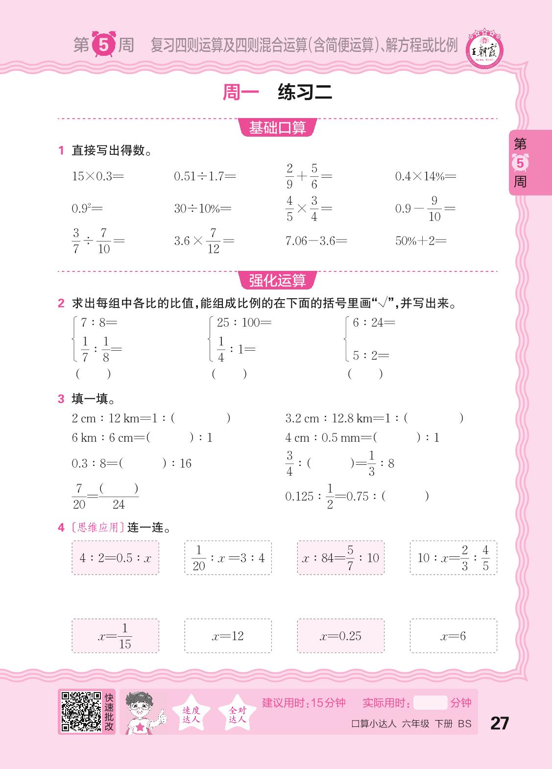 2024春下册六年级数学北师版 口算计算专练 第5周