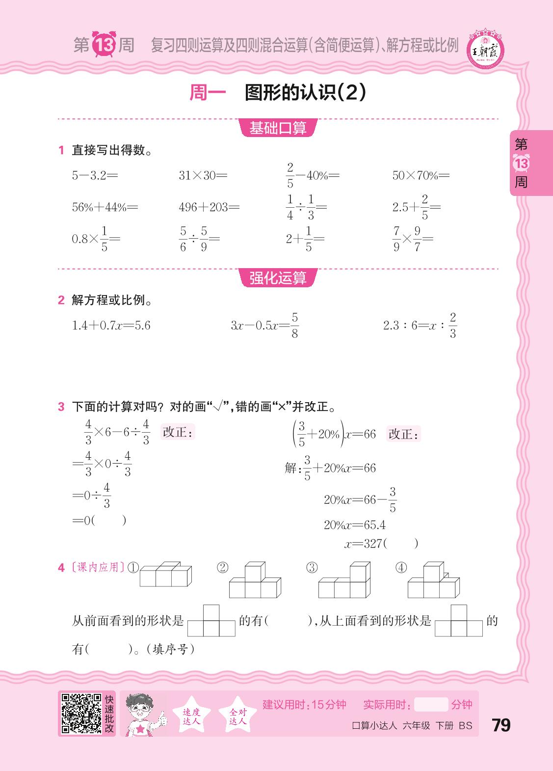 2024春下册六年级数学北师版 口算计算专练 第13周
