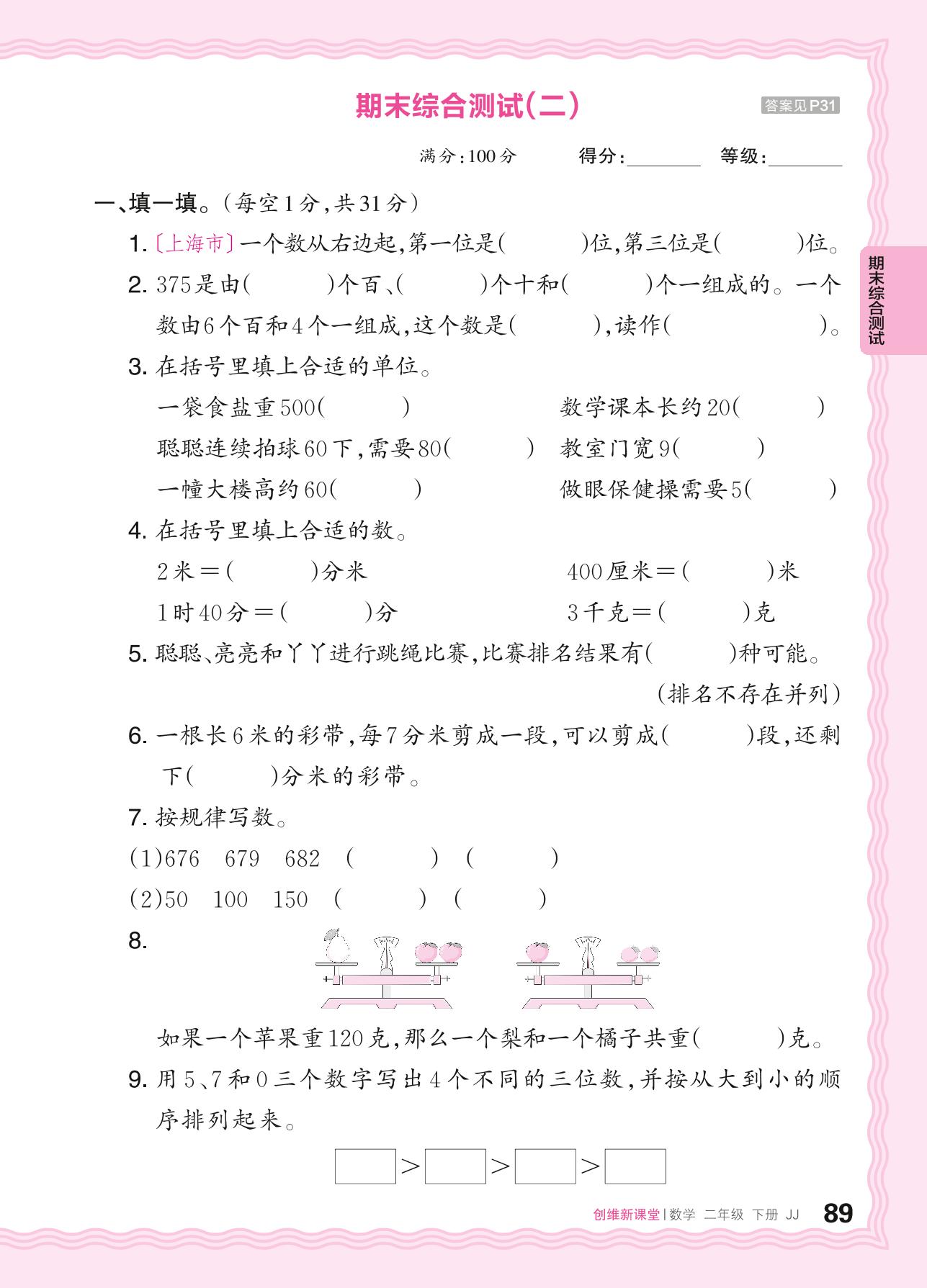 2024春下册二年级数学冀教版 期末综合测试(二)