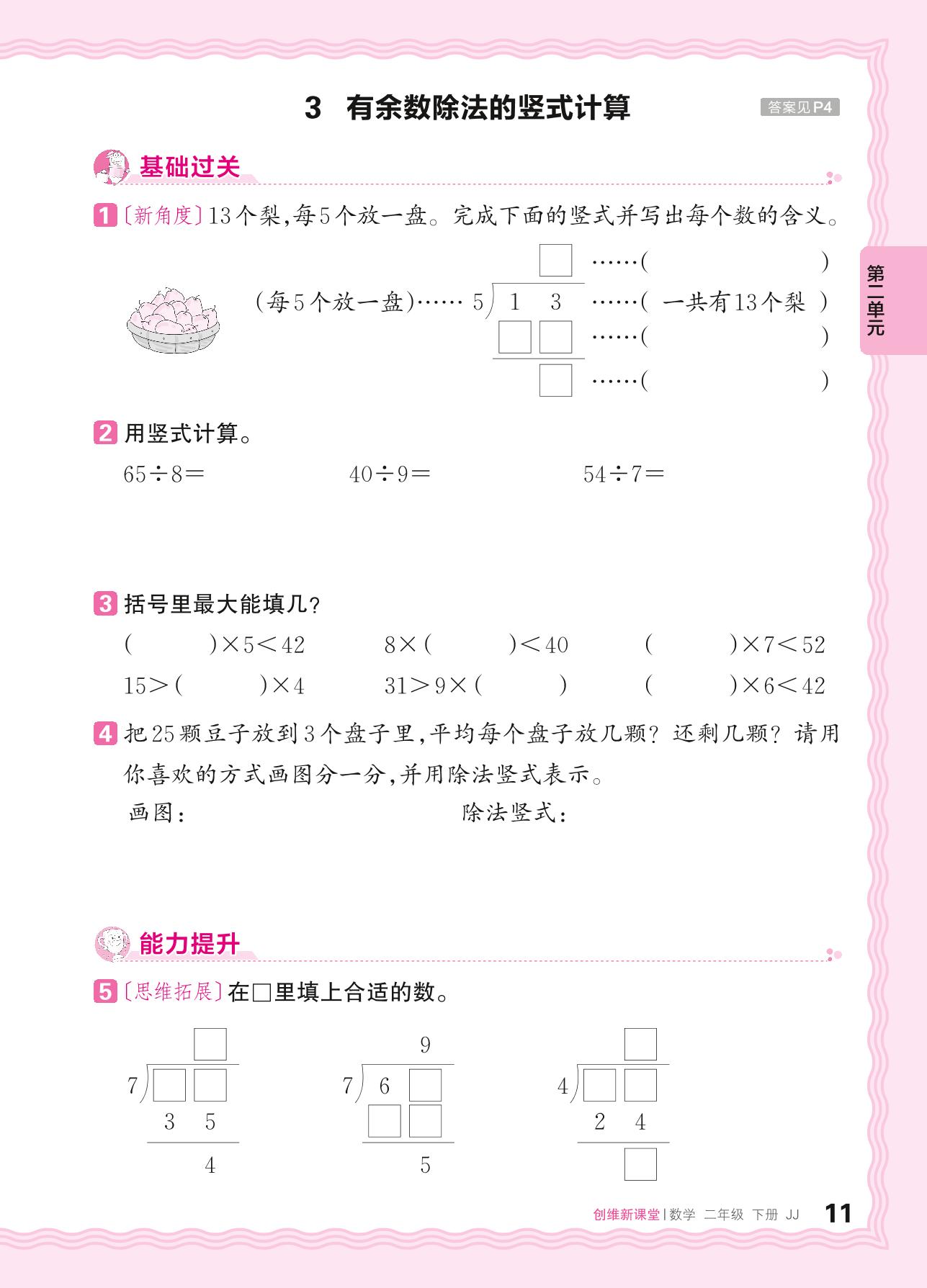 2024春下册二年级数学冀教版 第二单元 有余数的除法——3. 有余数除法的竖式计算