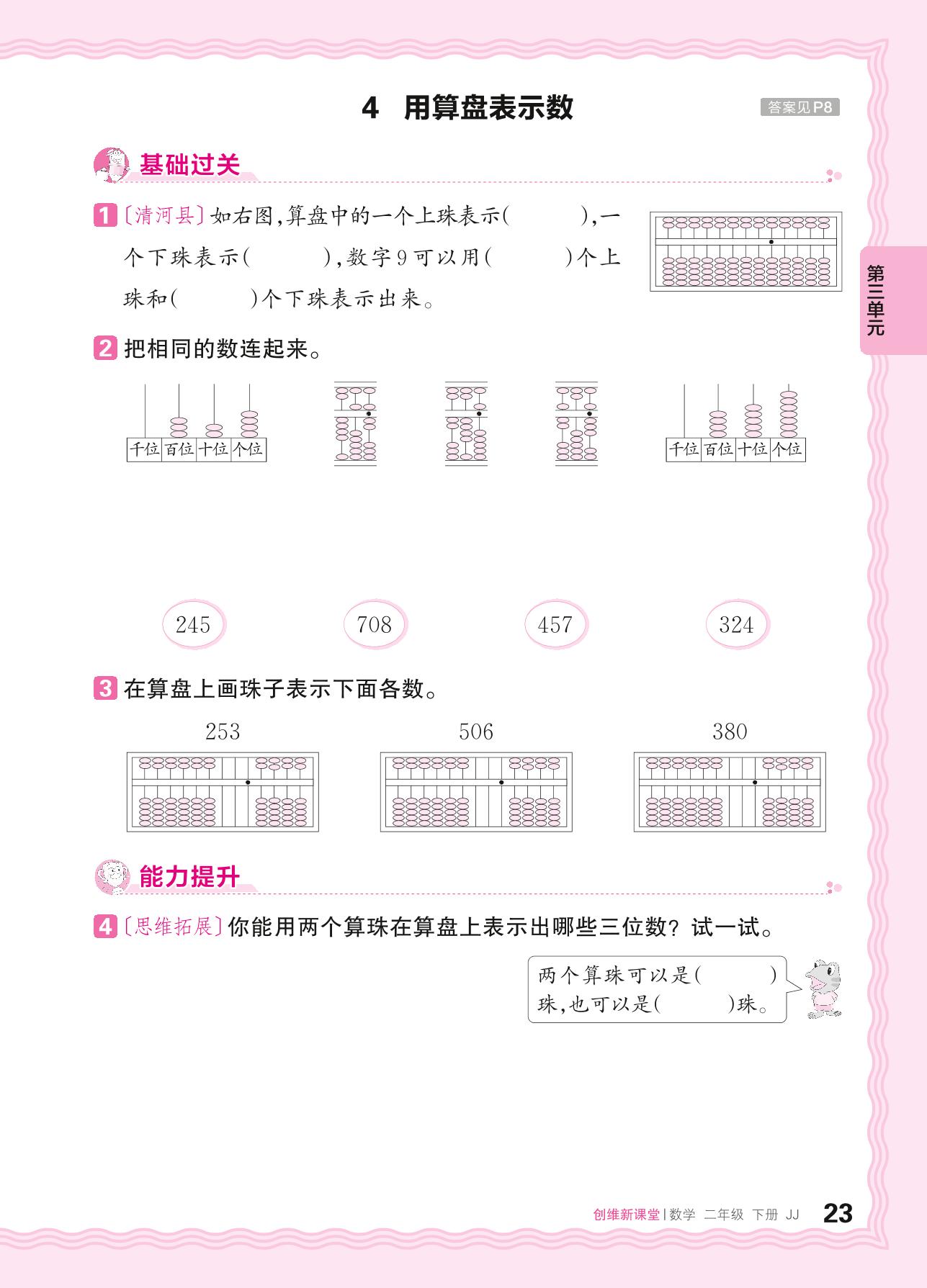 2024春下册二年级数学冀教版 第三单元 认识1000以内的数——4. 用算盘表示数