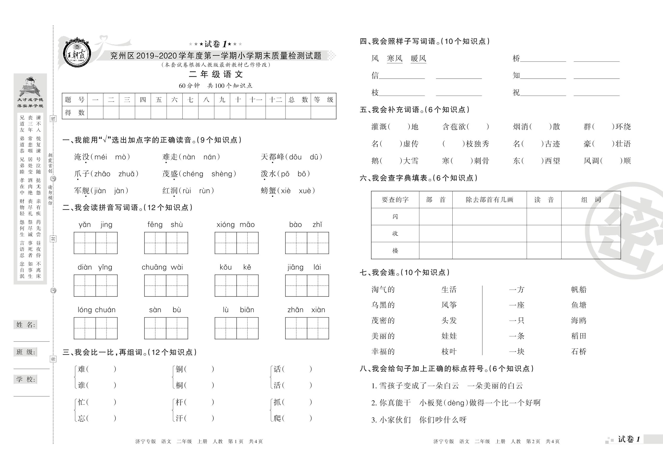 2019-2020学年第一学期济宁市兖州区二年级语文试卷(人教版)【1】