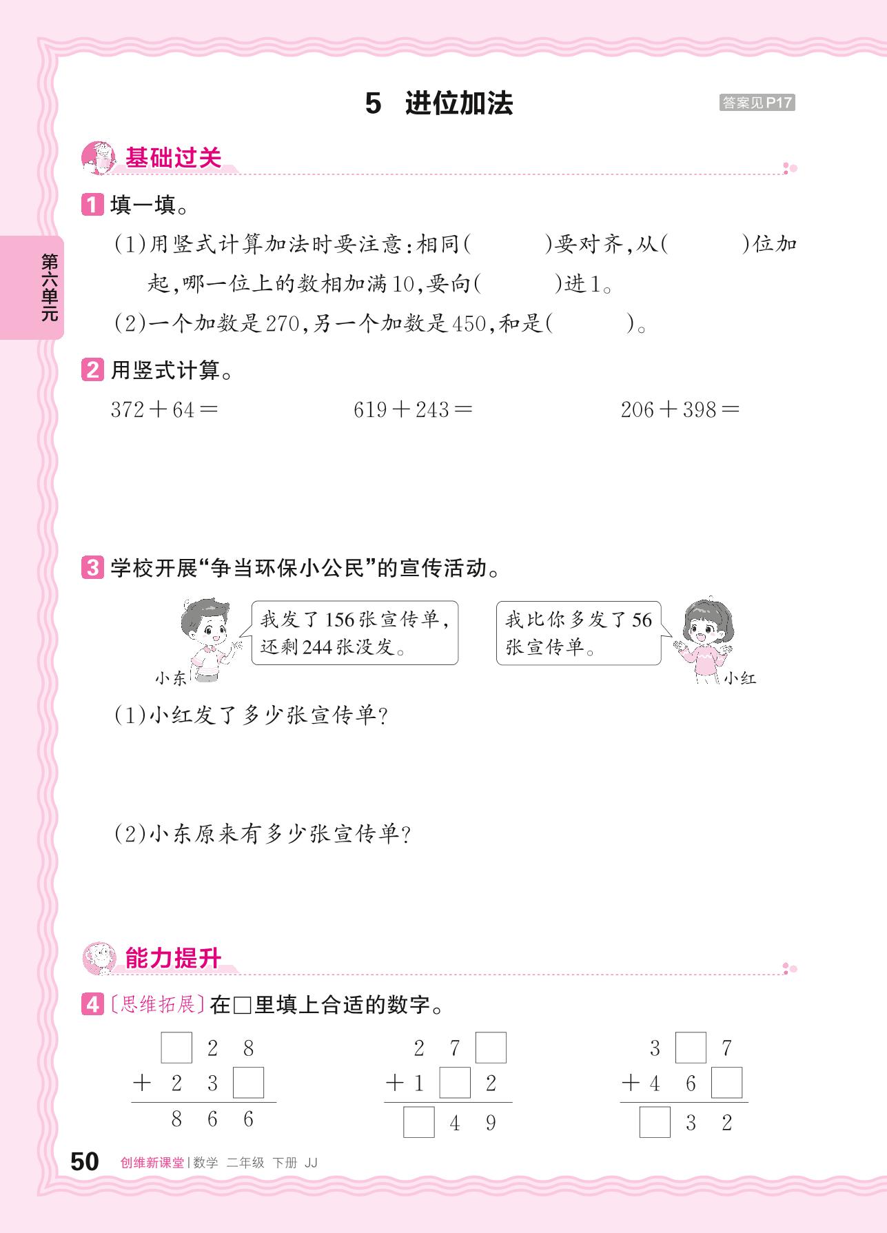 2024春下册二年级数学冀教版 第六单元 三位数加减三位数——5. 进位加法