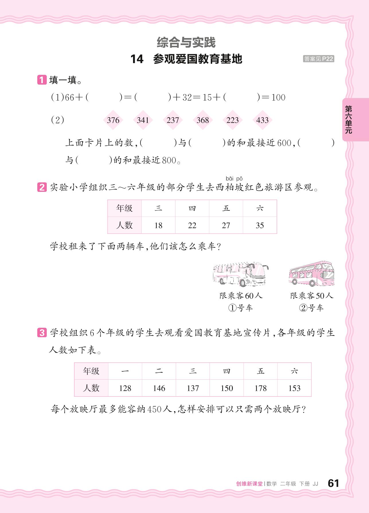 2024春下册二年级数学冀教版 第六单元 三位数加减三位数——14. 参观爱国教育基地