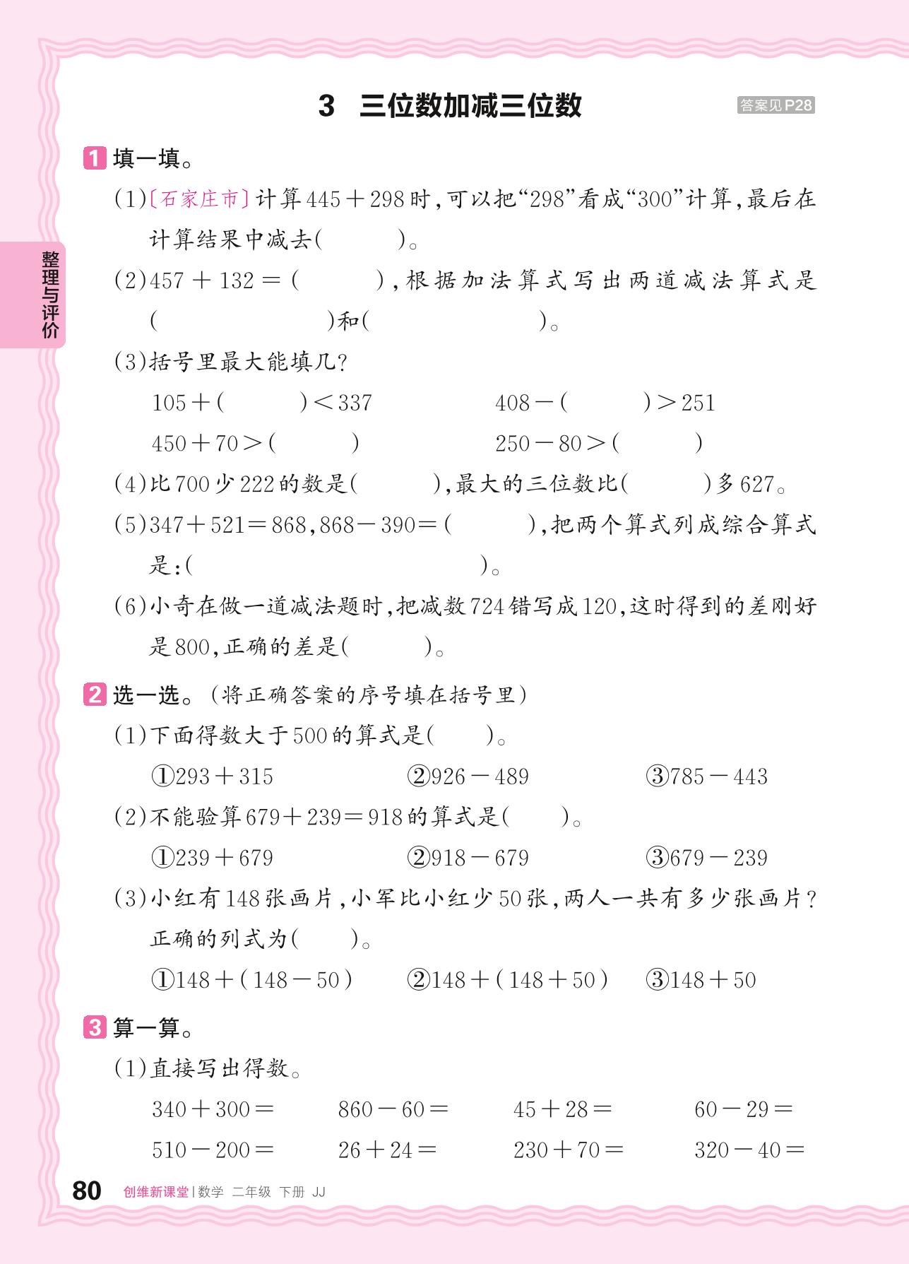 2024春下册二年级数学冀教版 整理与评价——3. 三位数加减三位数