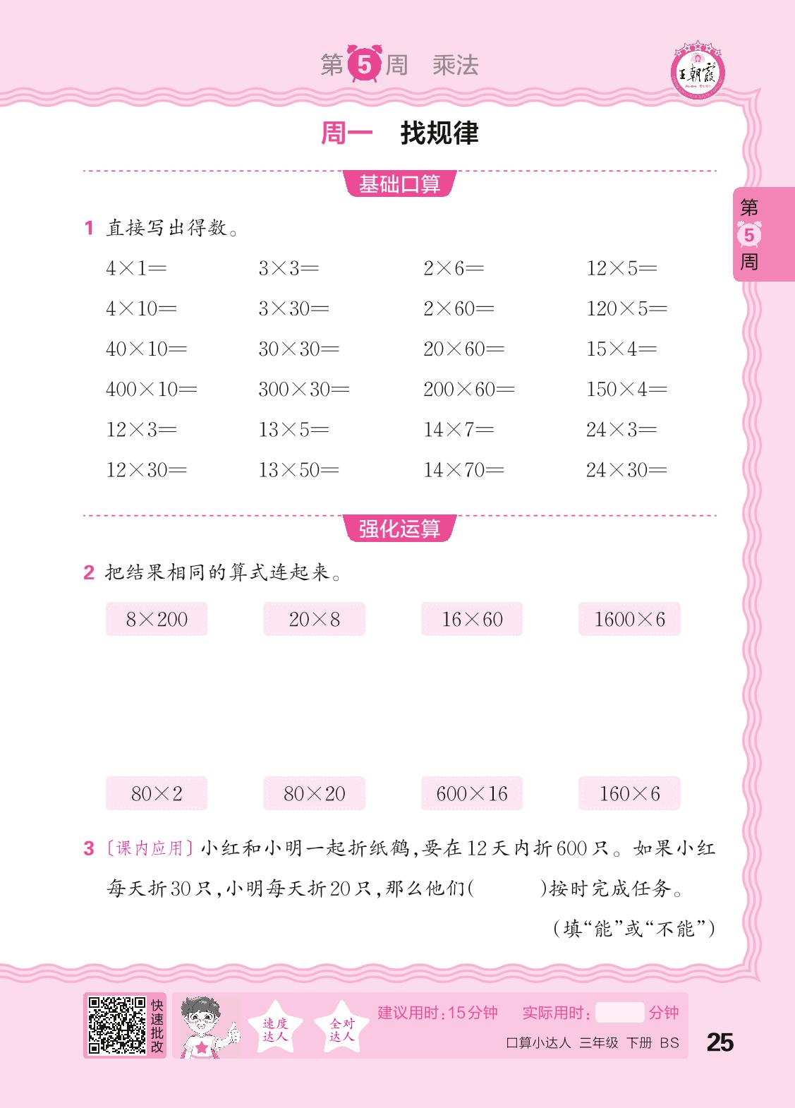 2024春下册三年级数学北师版 口算计算专练 第5周