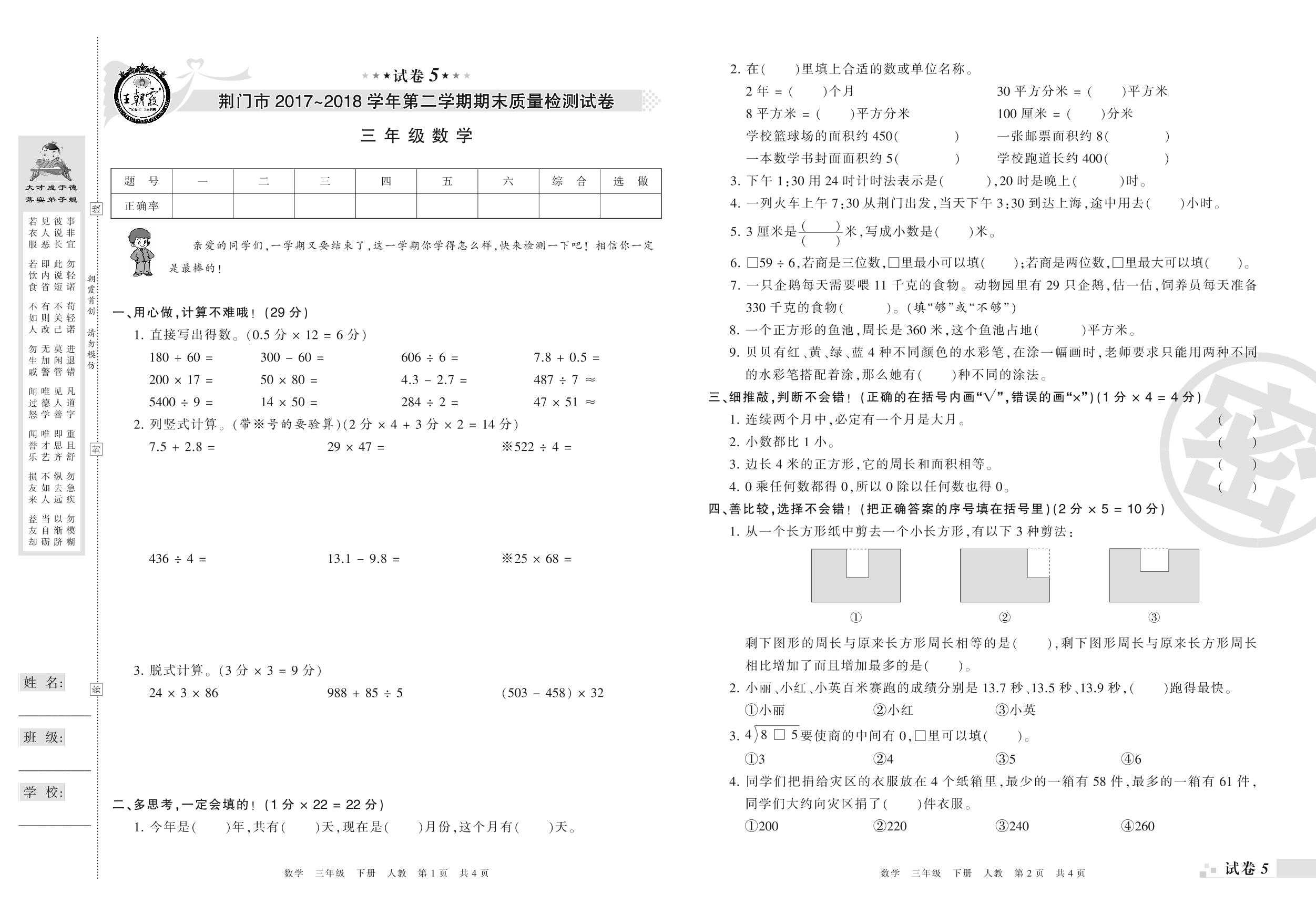 2017-2018学年第二学期荆门市三年级数学试卷(人教版)【5】