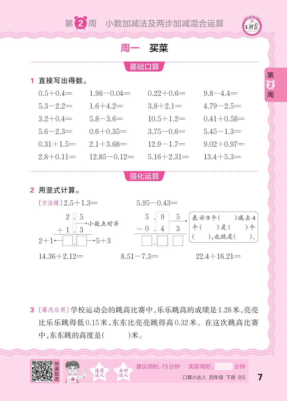 2024春下册四年级数学北师版 口算计算专练 第2周