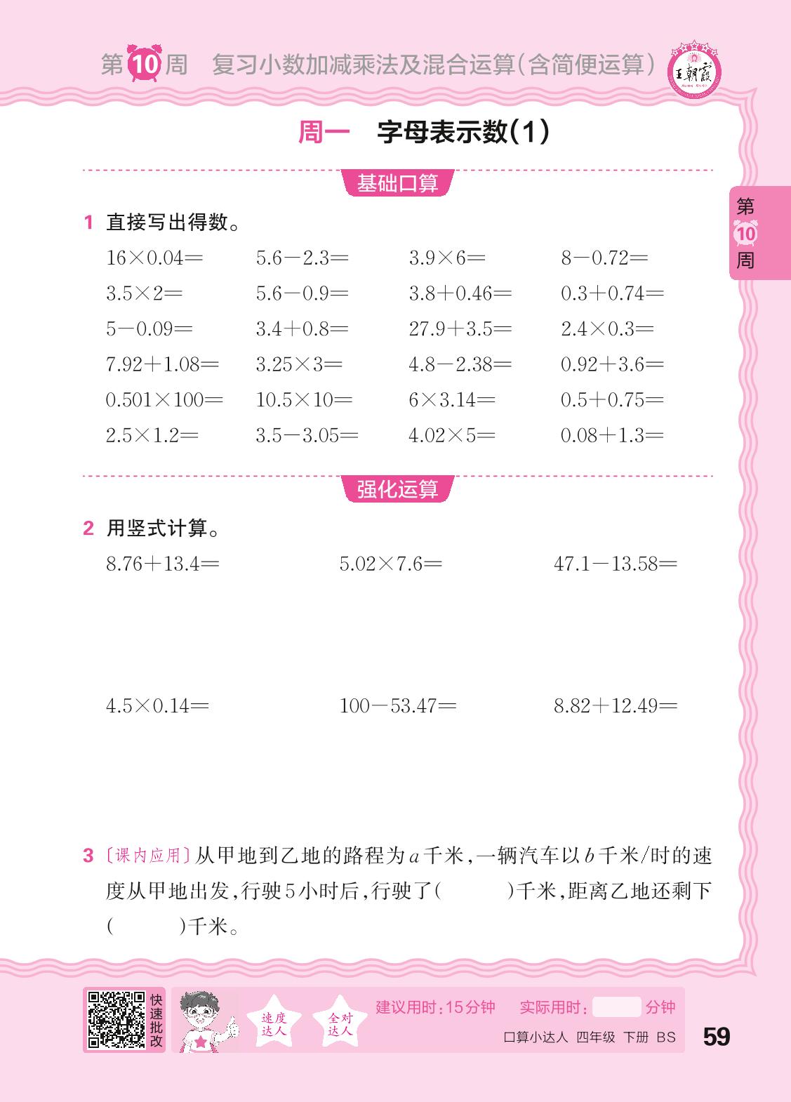 2024春下册四年级数学北师版 口算计算专练 第10周