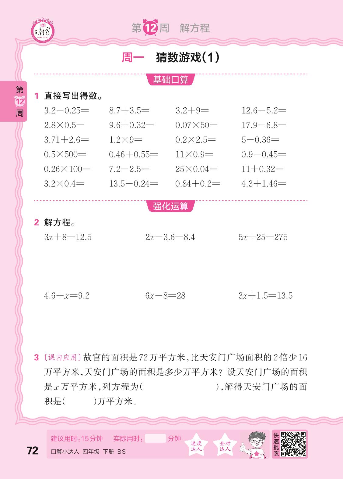 2024春下册四年级数学北师版 口算计算专练 第12周