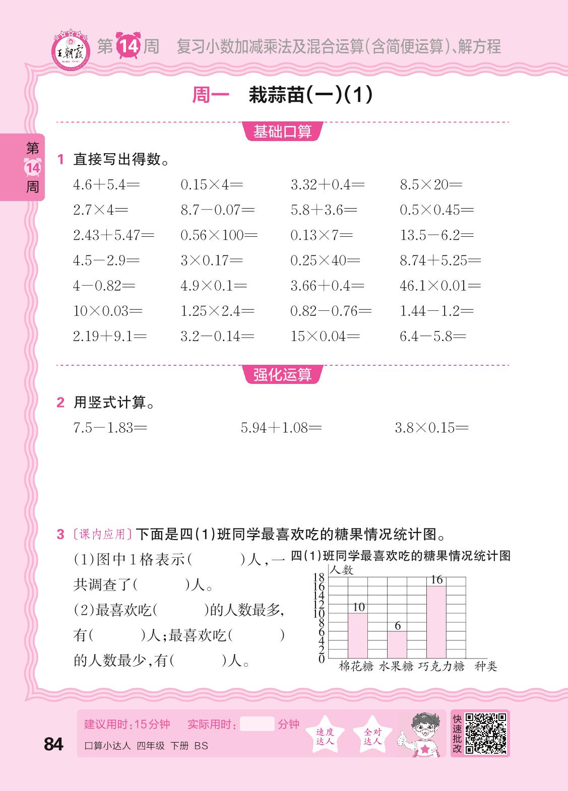 2024春下册四年级数学北师版 口算计算专练 第14周