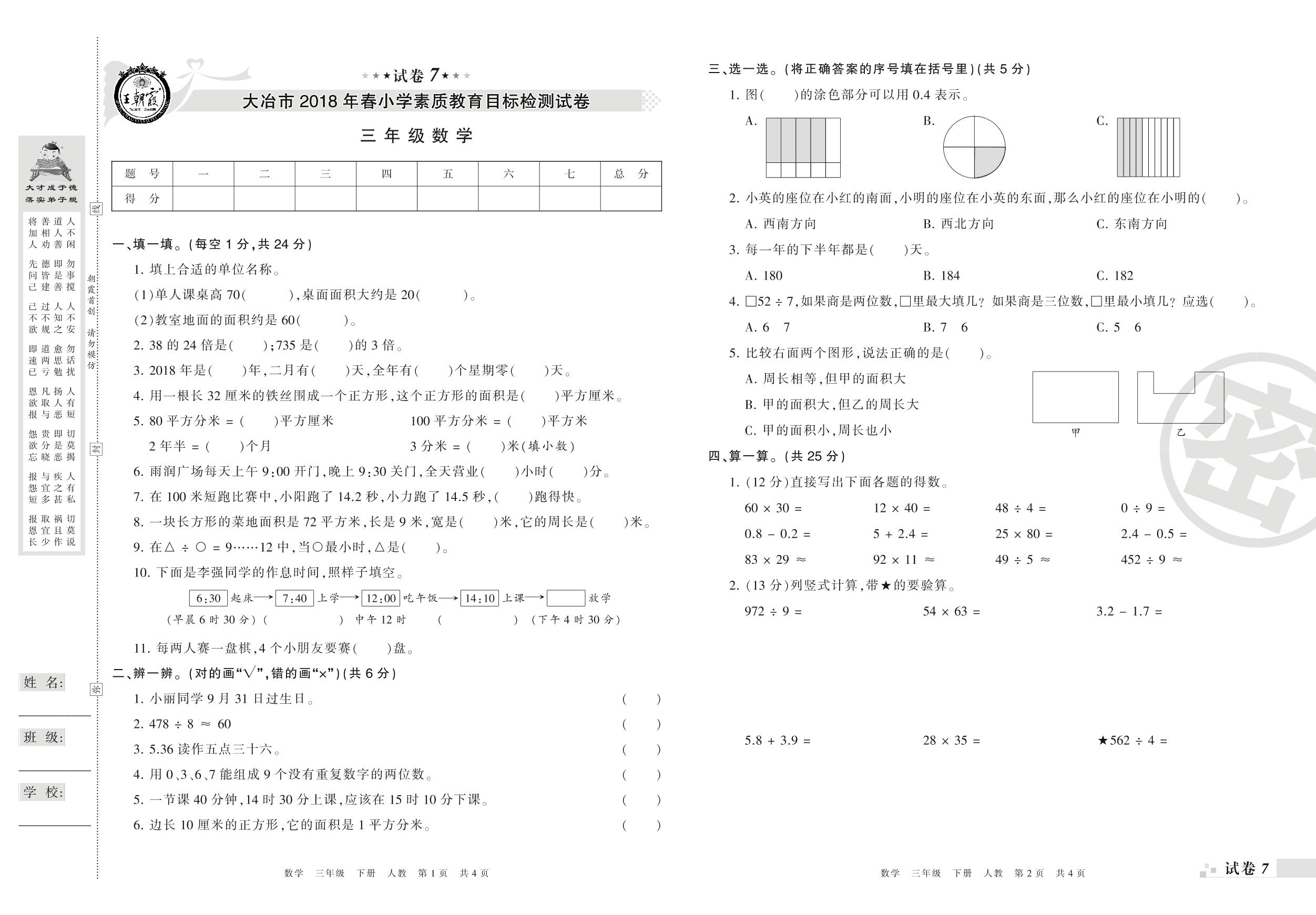 2017-2018学年第二学期大冶市三年级数学试卷(人教版)【7】