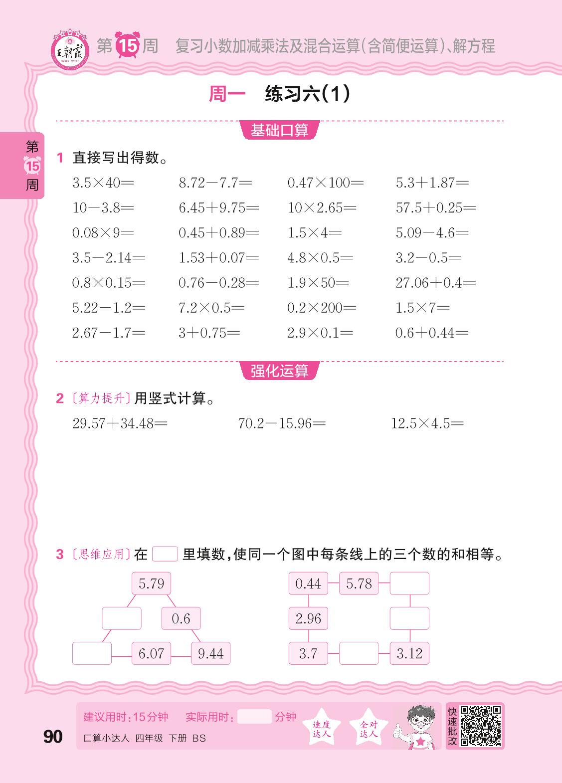 2024春下册四年级数学北师版 口算计算专练 第15周