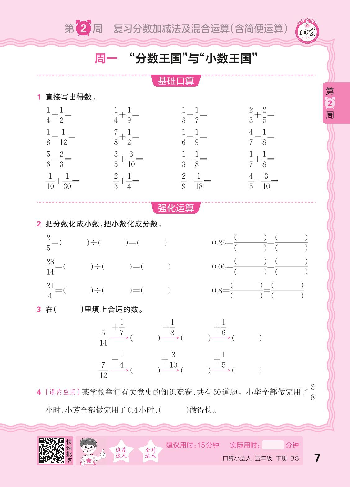 2024春下册五年级数学北师版 口算计算专练 第2周