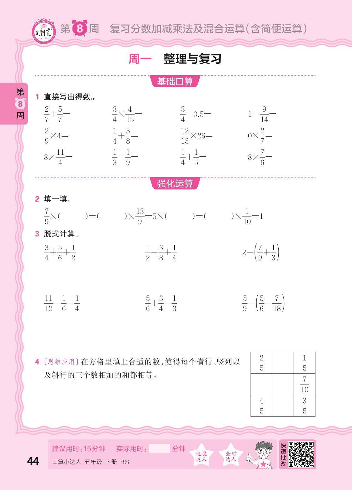 2024春下册五年级数学北师版 口算计算专练 第8周