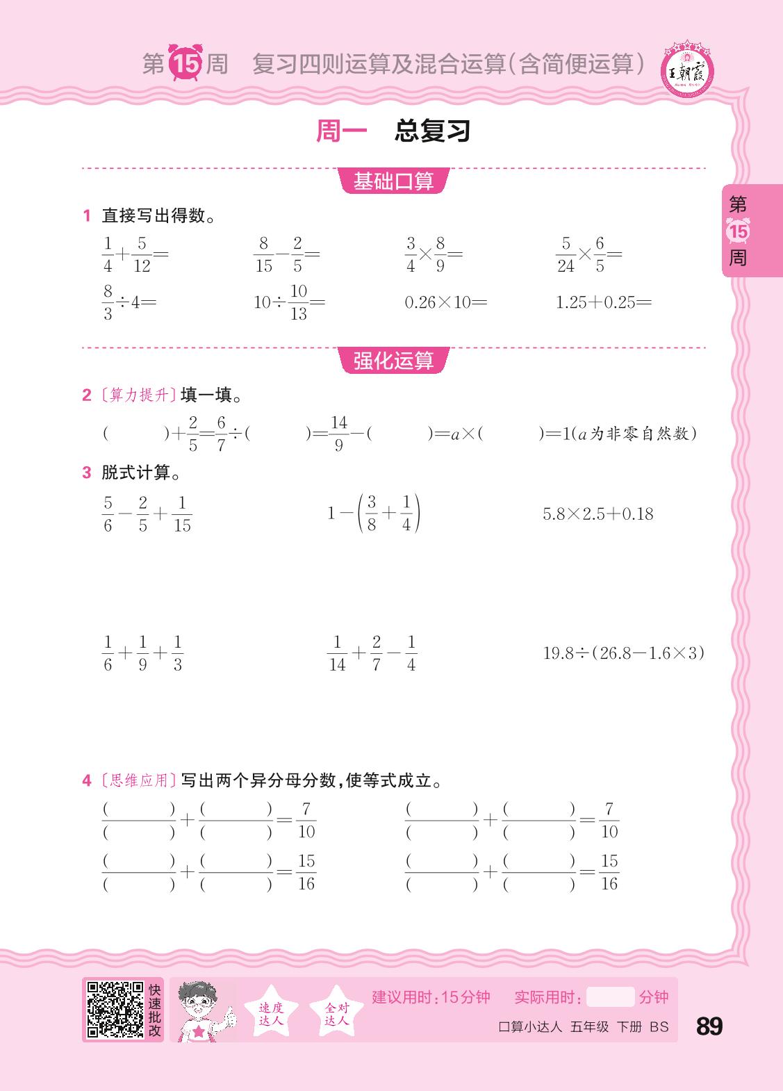 2024春下册五年级数学北师版 口算计算专练 第15周