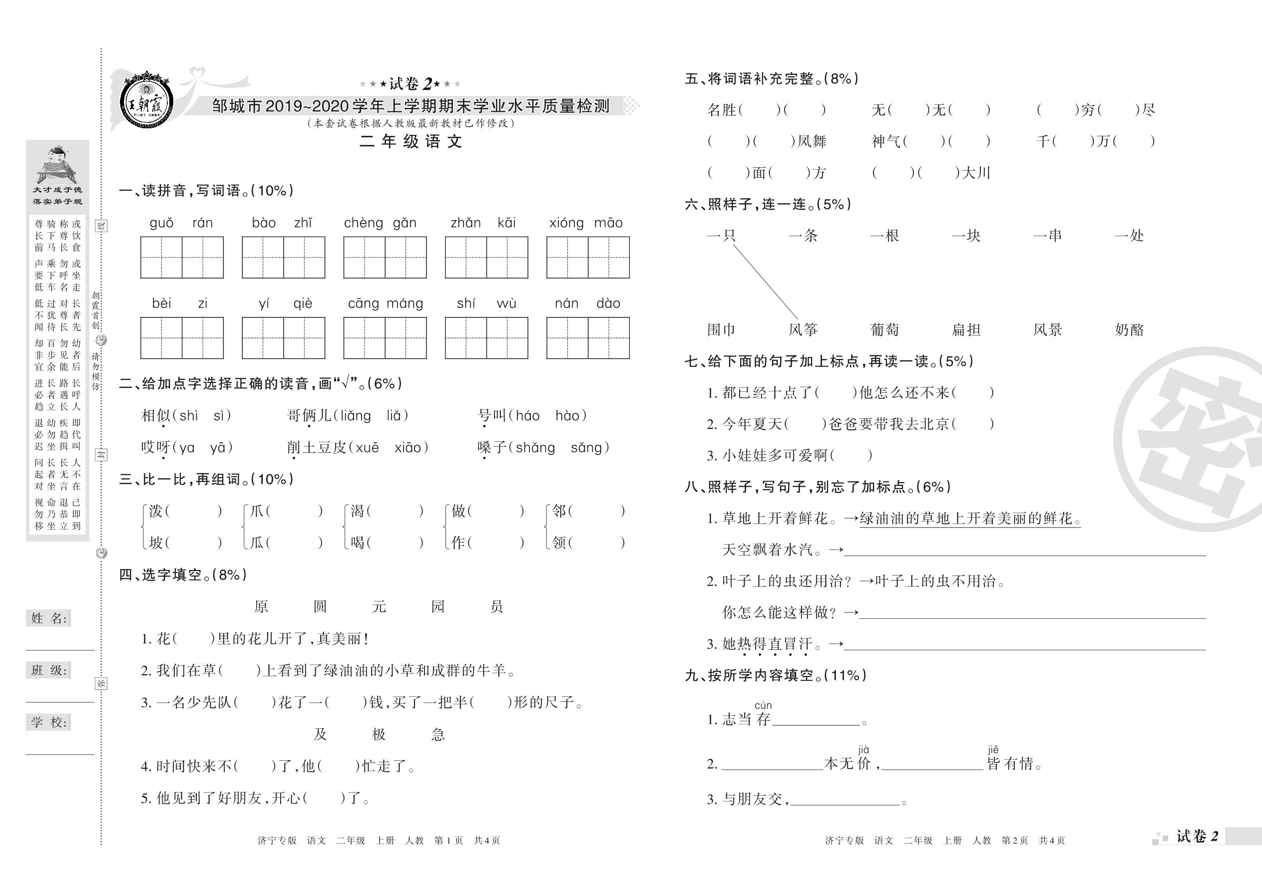 2019-2020学年第一学期邹城市二年级语文试卷(人教版)【2】
