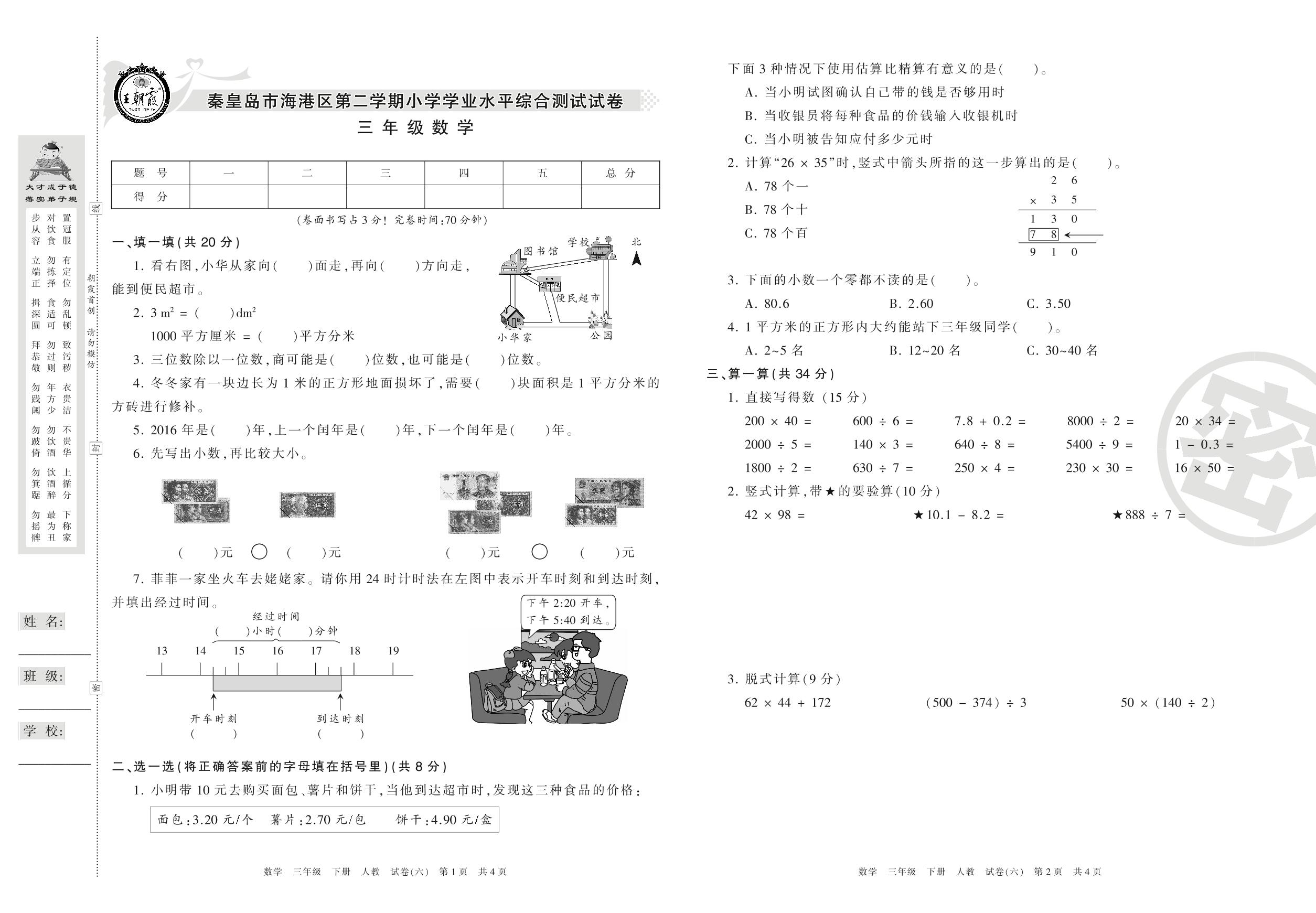 2015-2016学年第二学期秦皇岛市海港区三年级数学试卷(人教版)【6】
