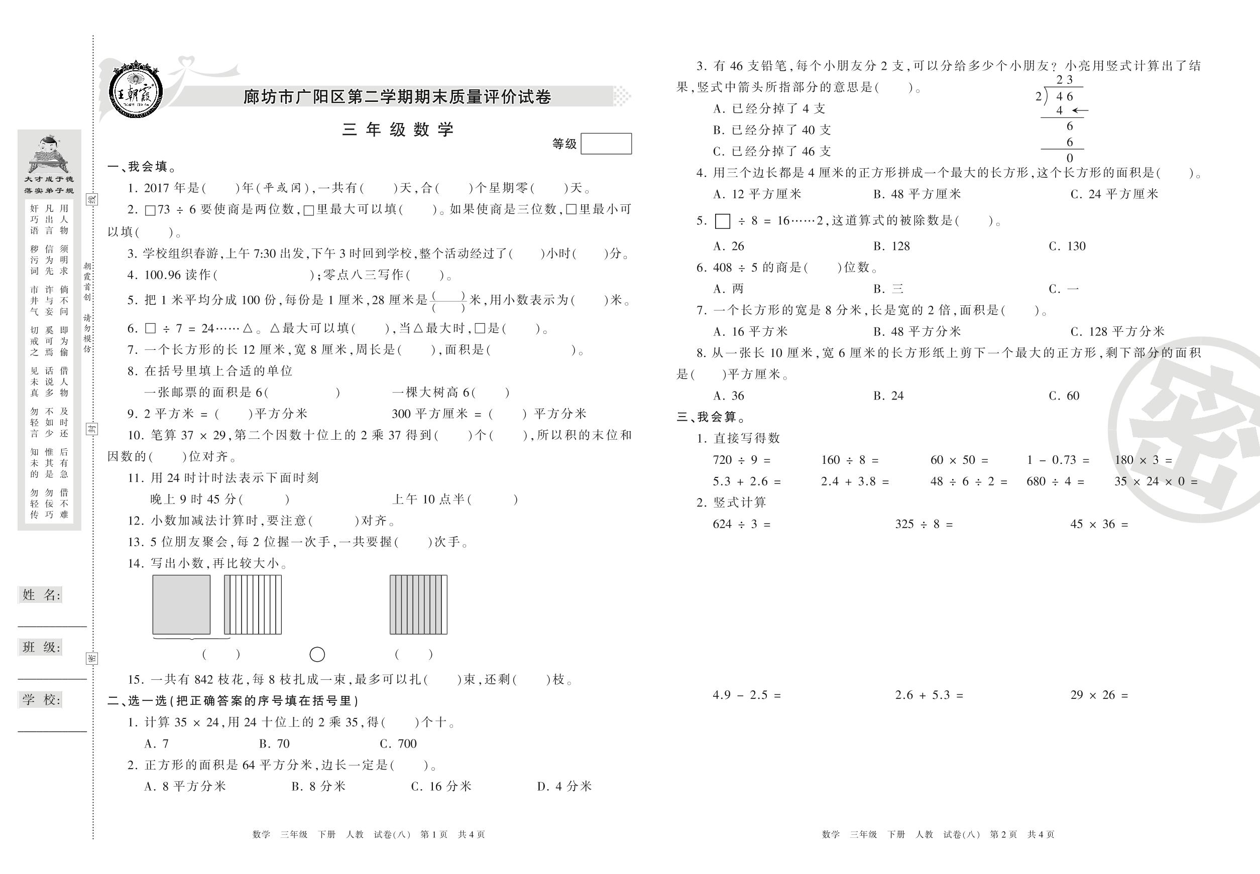 2015-2016学年第二学期廊坊市广阳区三年级数学试卷(人教版)【8】