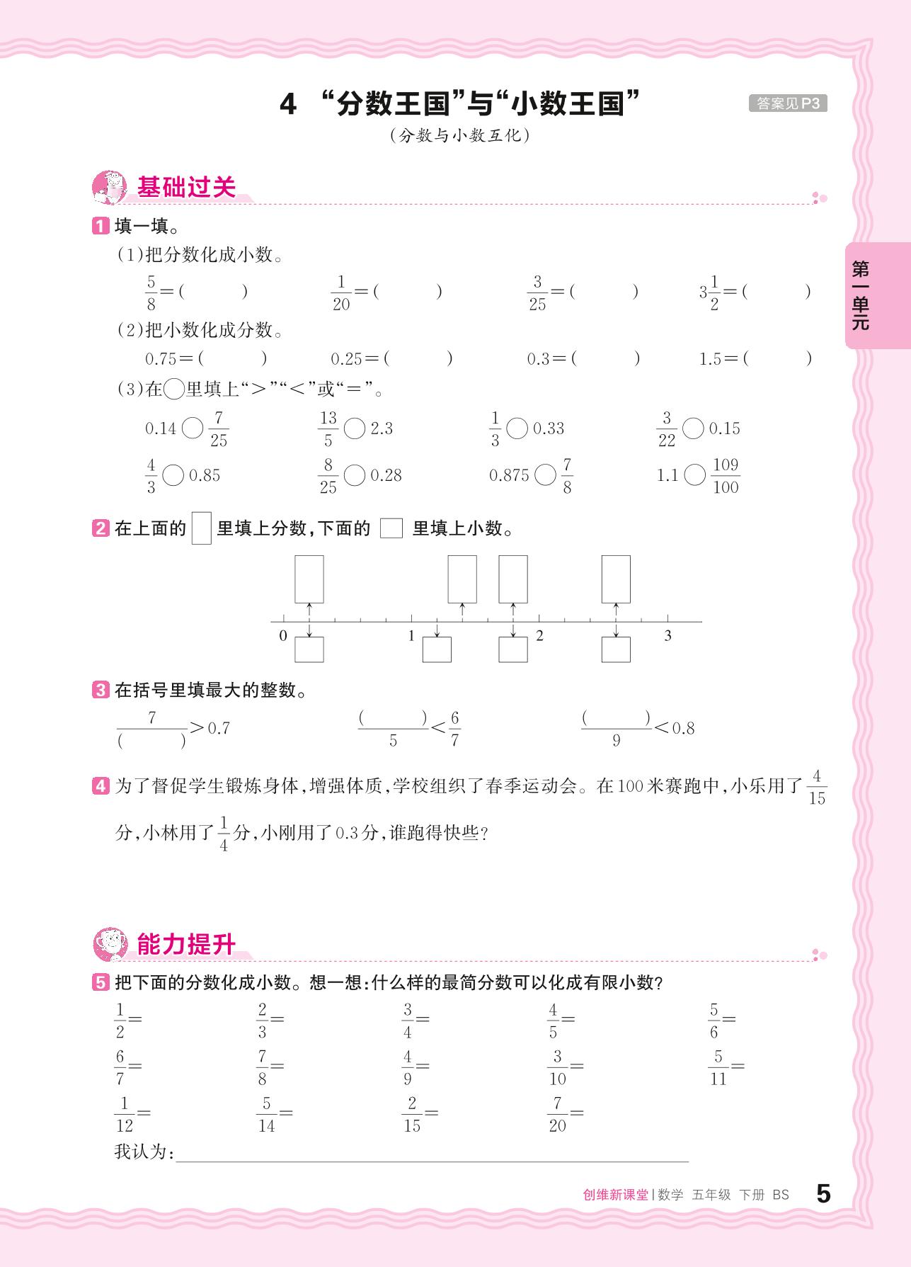 2024春下册五年级数学北师版 第一单元 分数加减法——4. “分数王国”与“小数王国”