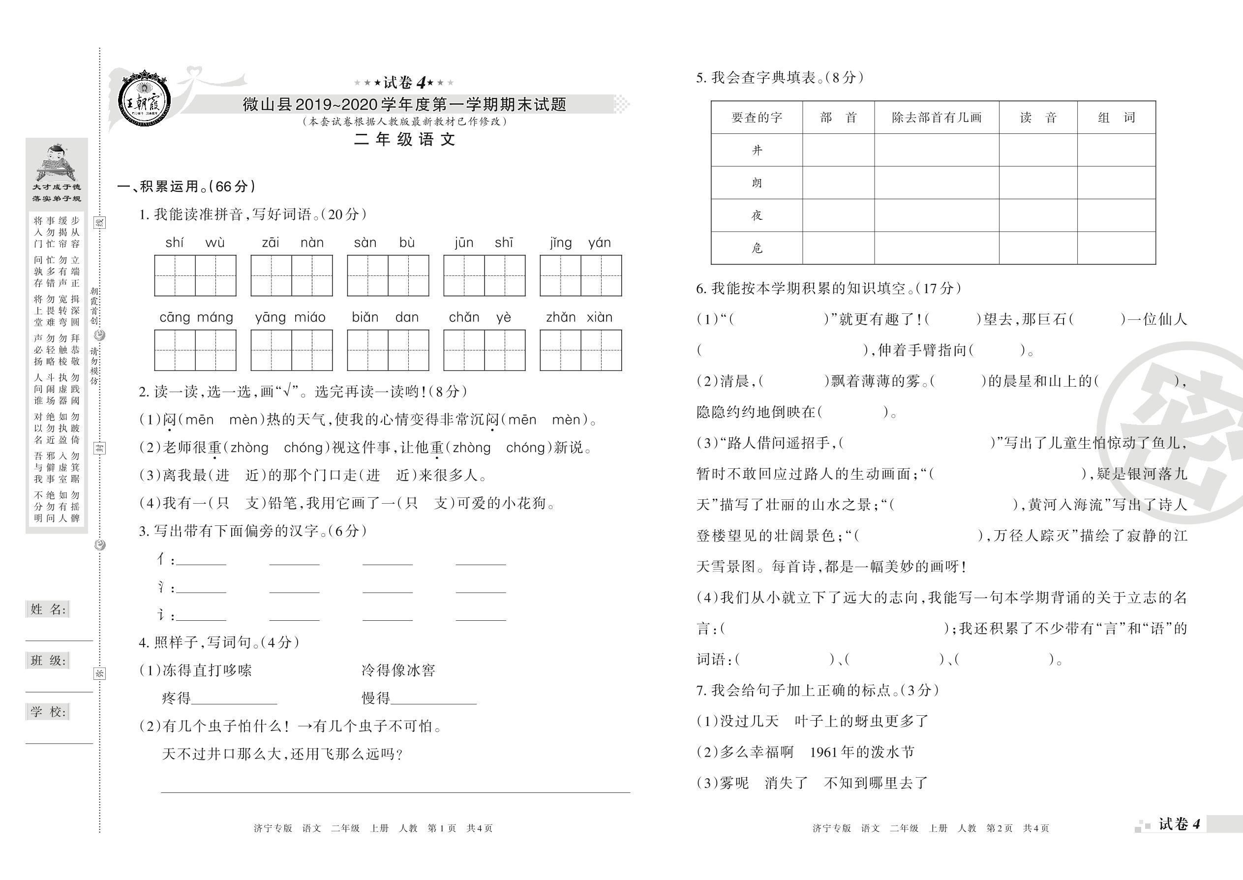 2019-2020学年第一学期济宁市微山县二年级语文试卷(人教版)【4】