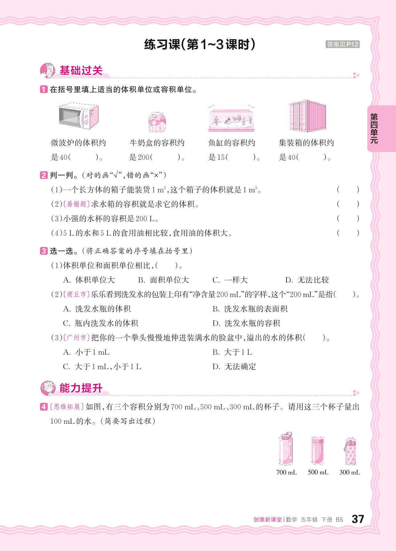 2024春下册五年级数学北师版 第四单元 长方体(二)——体积与容积、体积单位练习课