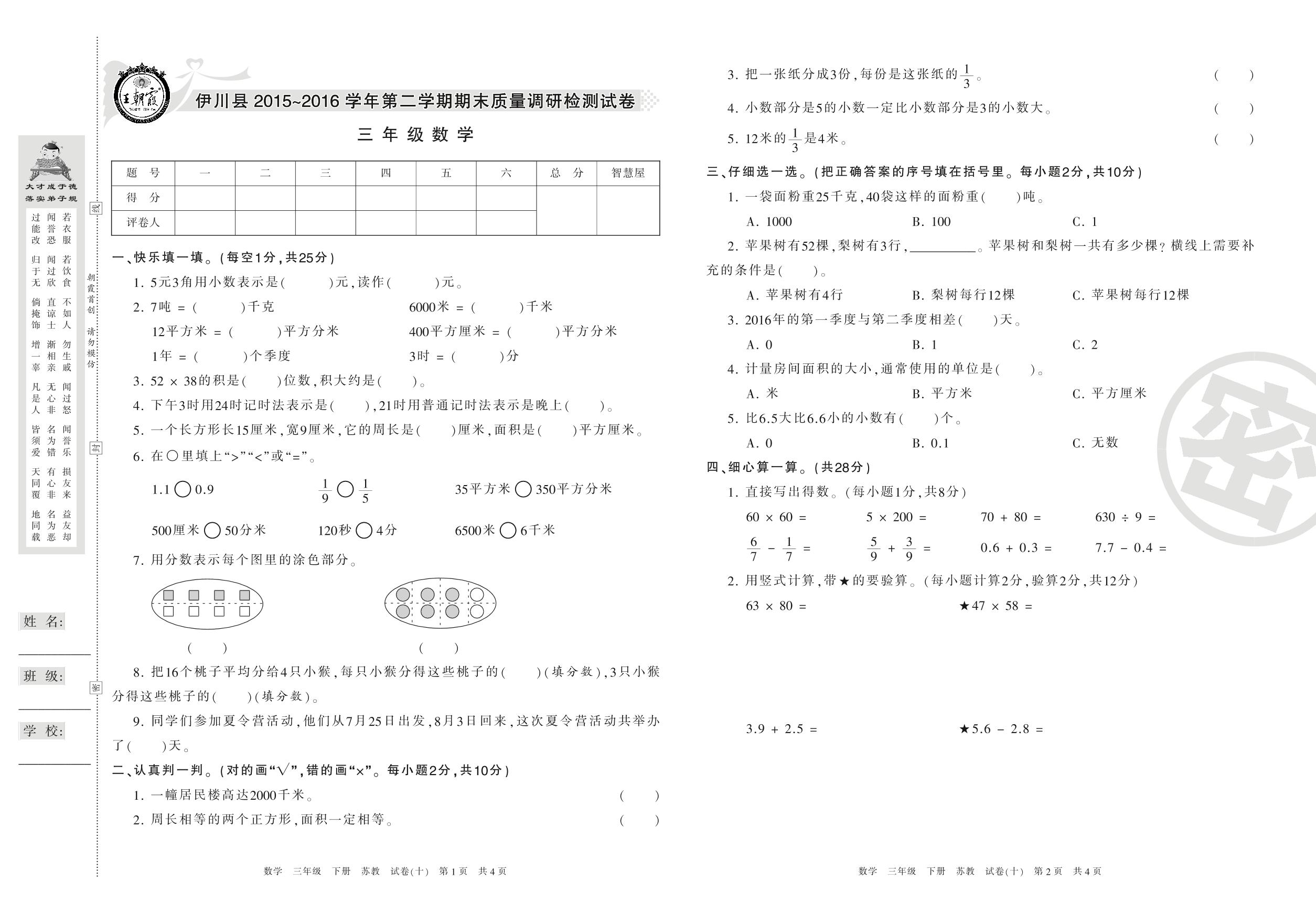 2015-2016学年第二学期洛阳市伊川县三年级数学试卷(苏教版)【10】