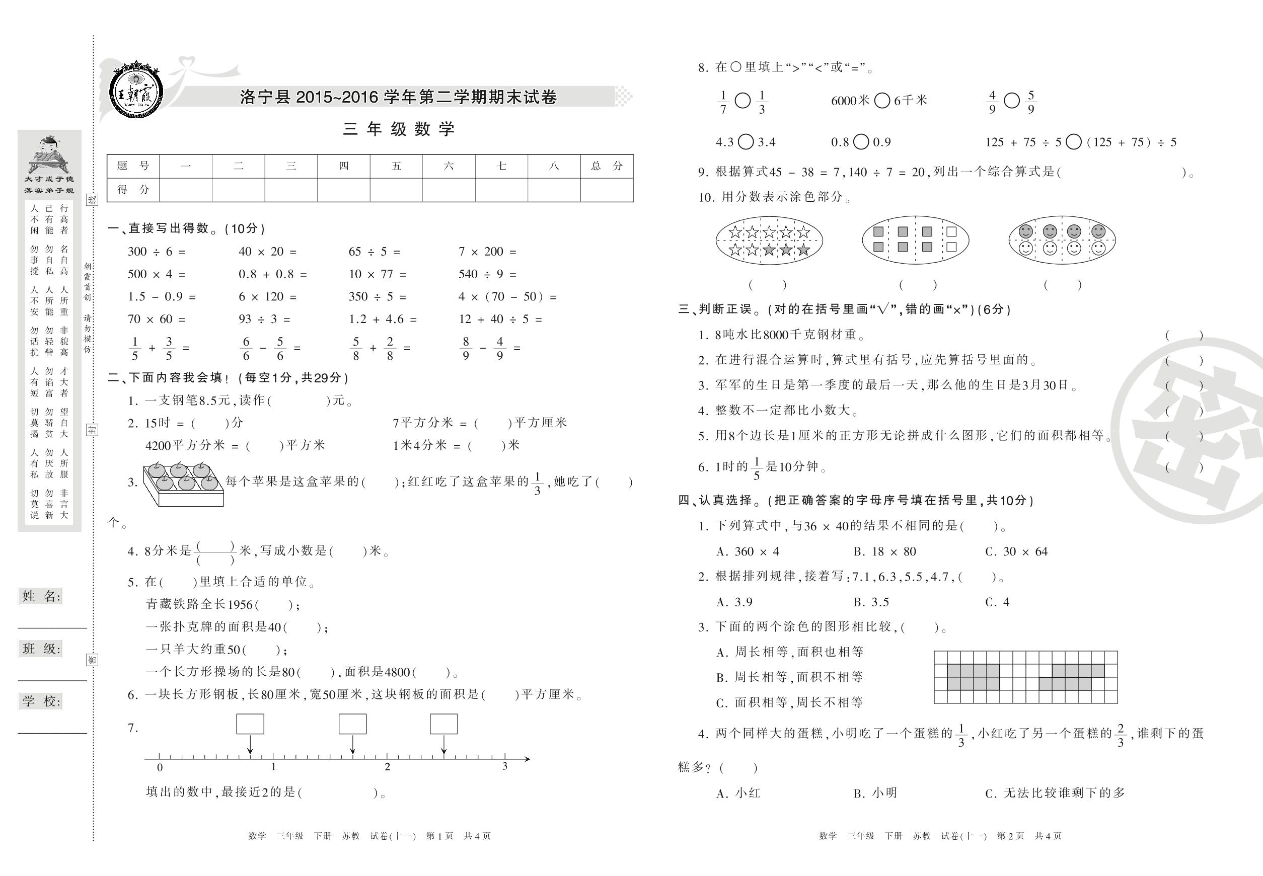 2015-2016学年第二学期洛阳市洛宁县三年级数学试卷(苏教版)【11】