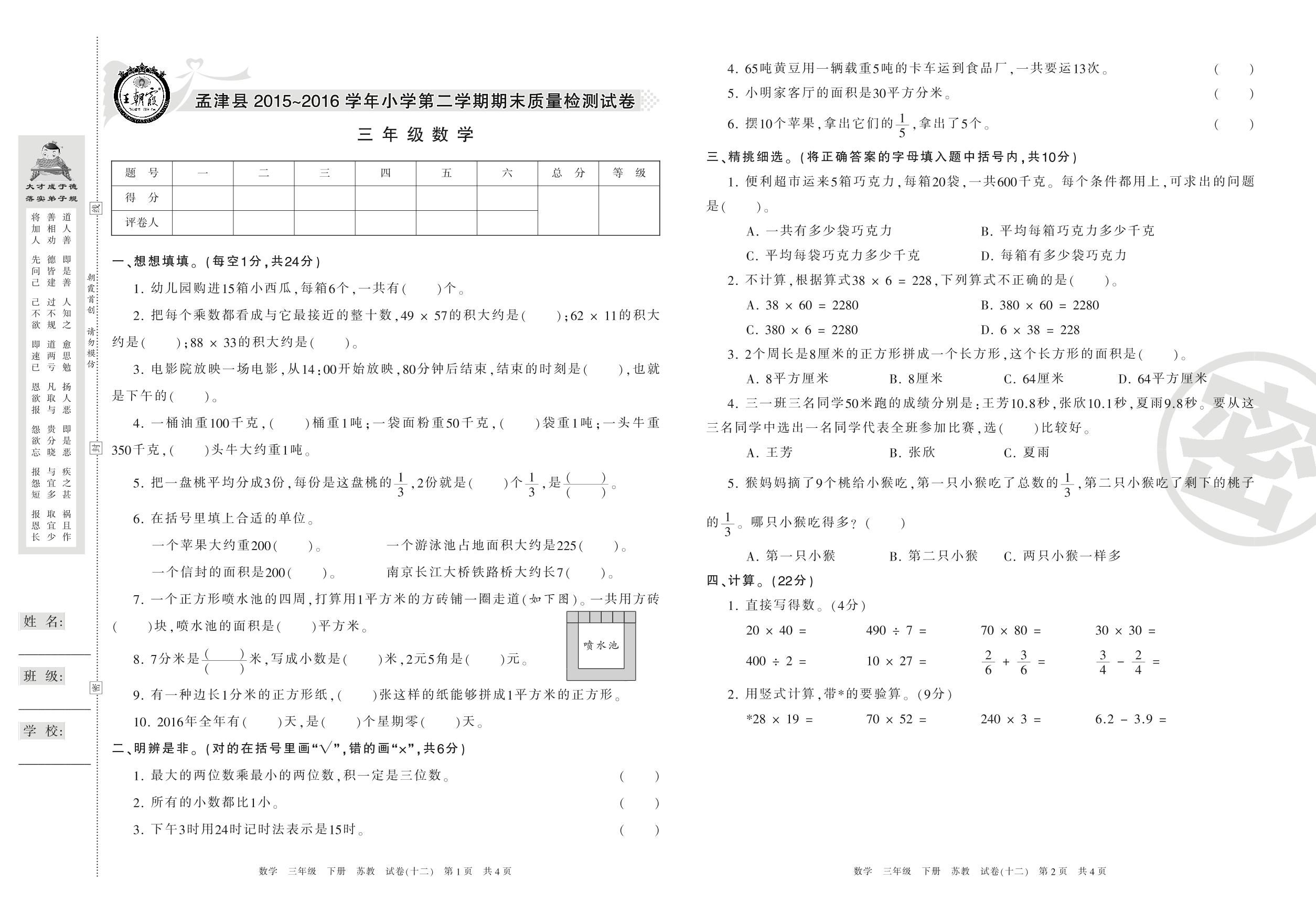 2015-2016学年第二学期洛阳市孟津县三年级数学试卷(苏教版)【12】