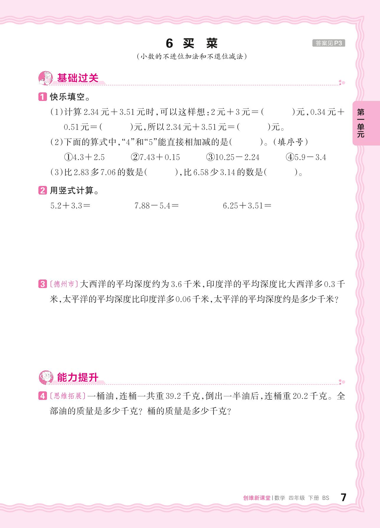 2024春下册四年级数学北师版 第一单元 小数的意义和加减法——6. 买菜