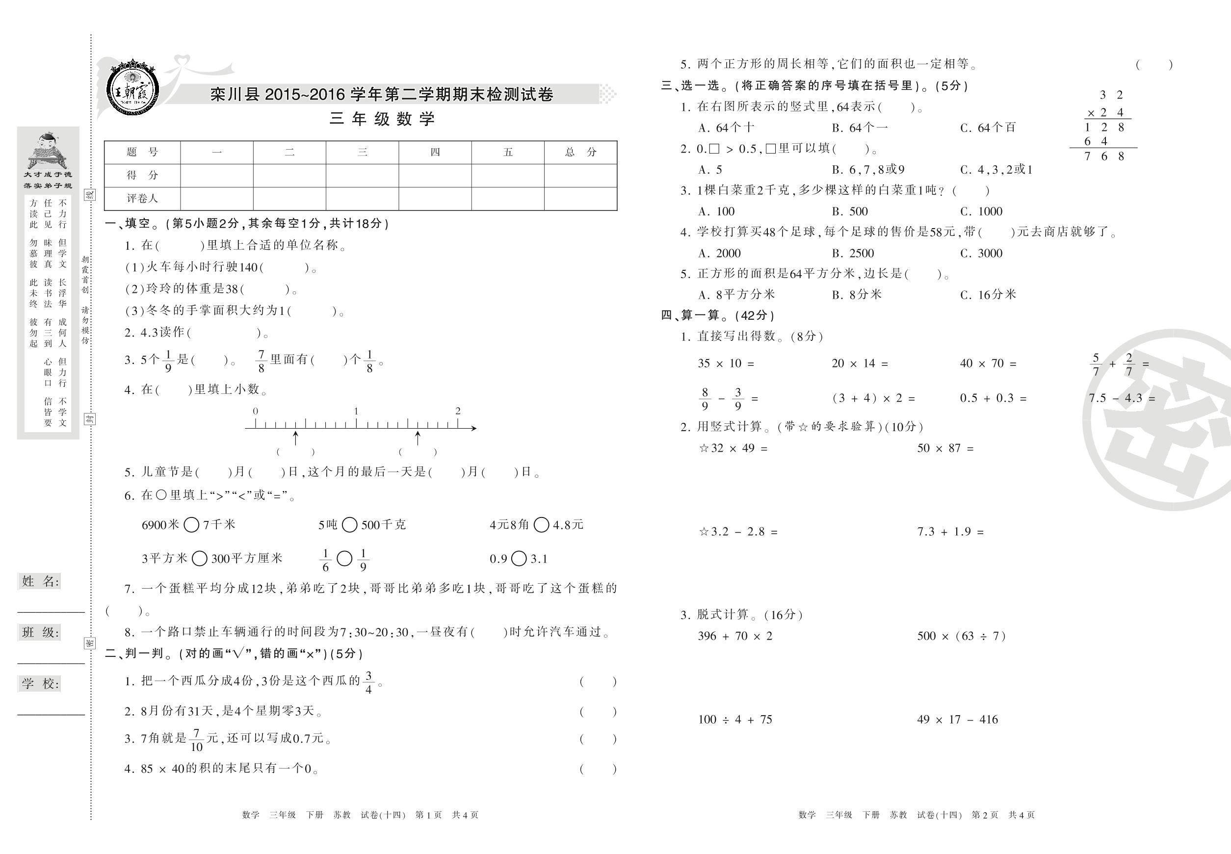 三年级数学苏教版下册期末卷