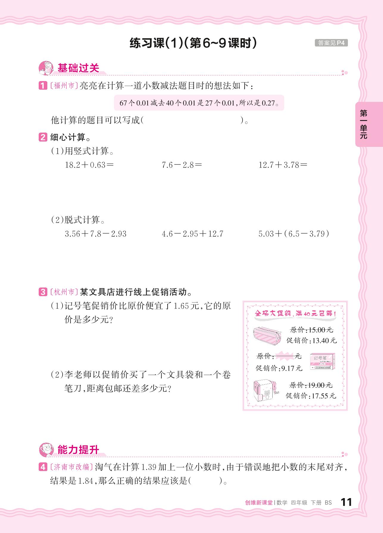 2024春下册四年级数学北师版 第一单元小数的意义和加减法练习课(1)