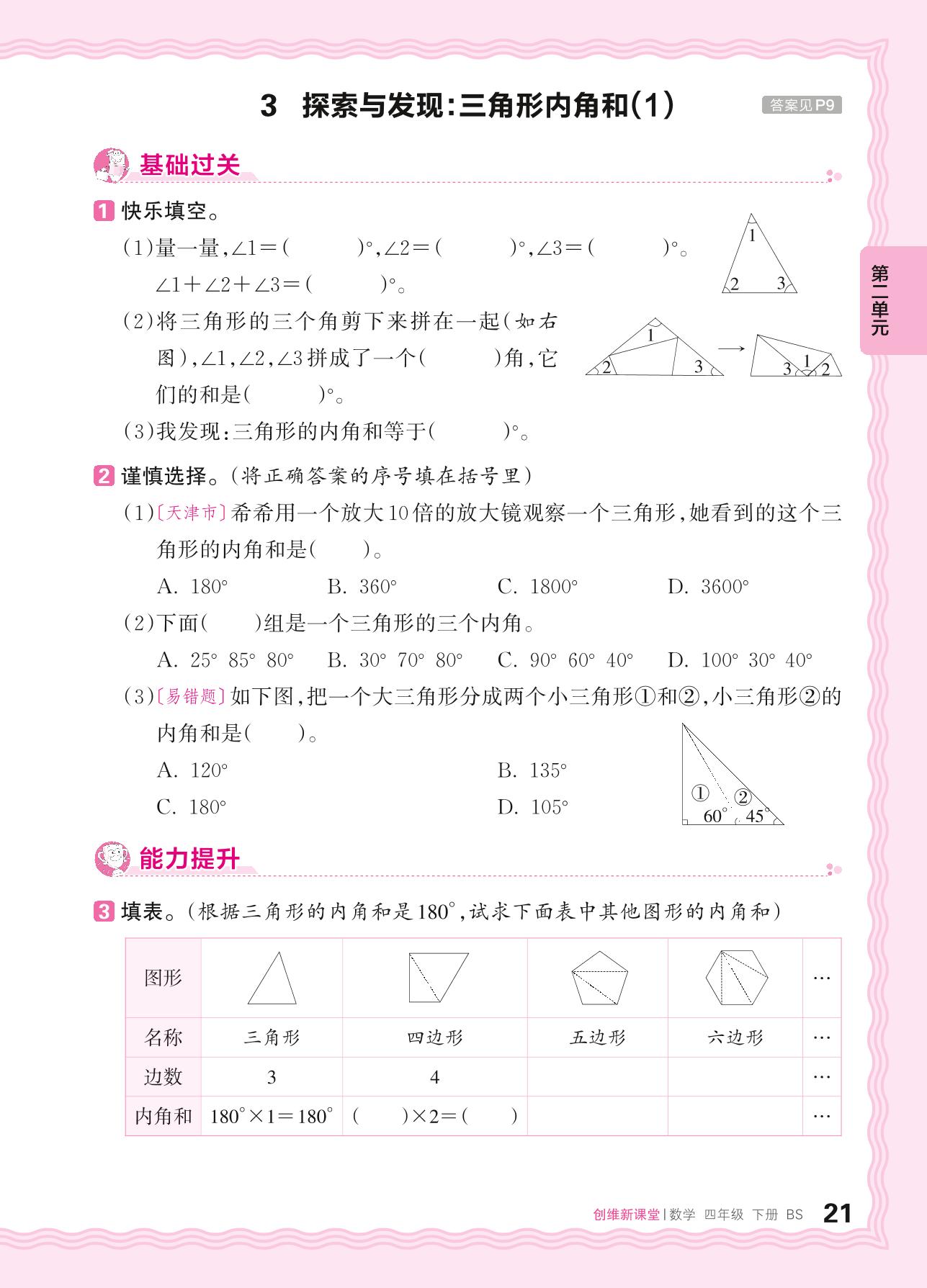 2024春下册四年级数学北师版 第二单元 认识三角形和四边形——3. 探索与发现:三角形内角和(1)