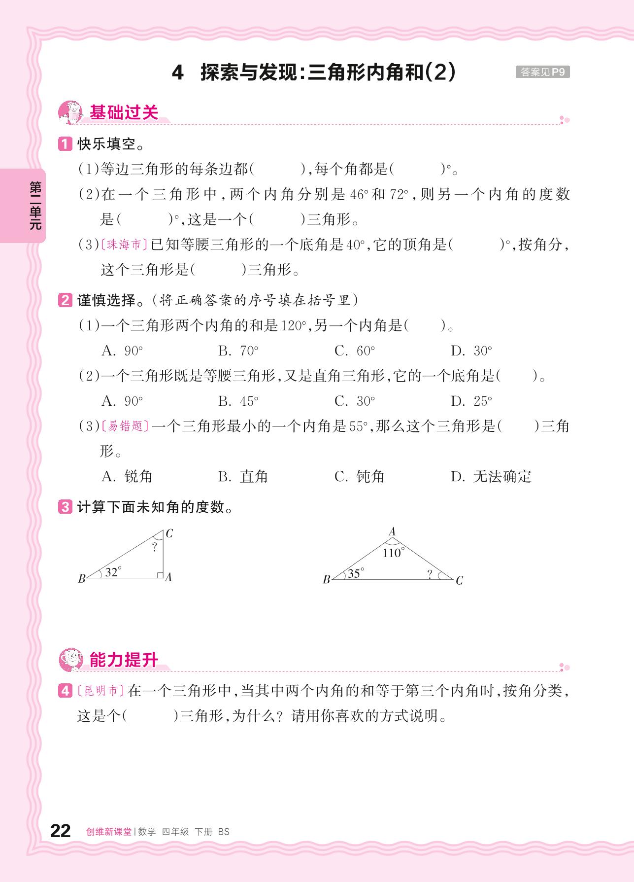 2024春下册四年级数学北师版 第二单元 认识三角形和四边形——4. 探索与发现:三角形内角和(2)
