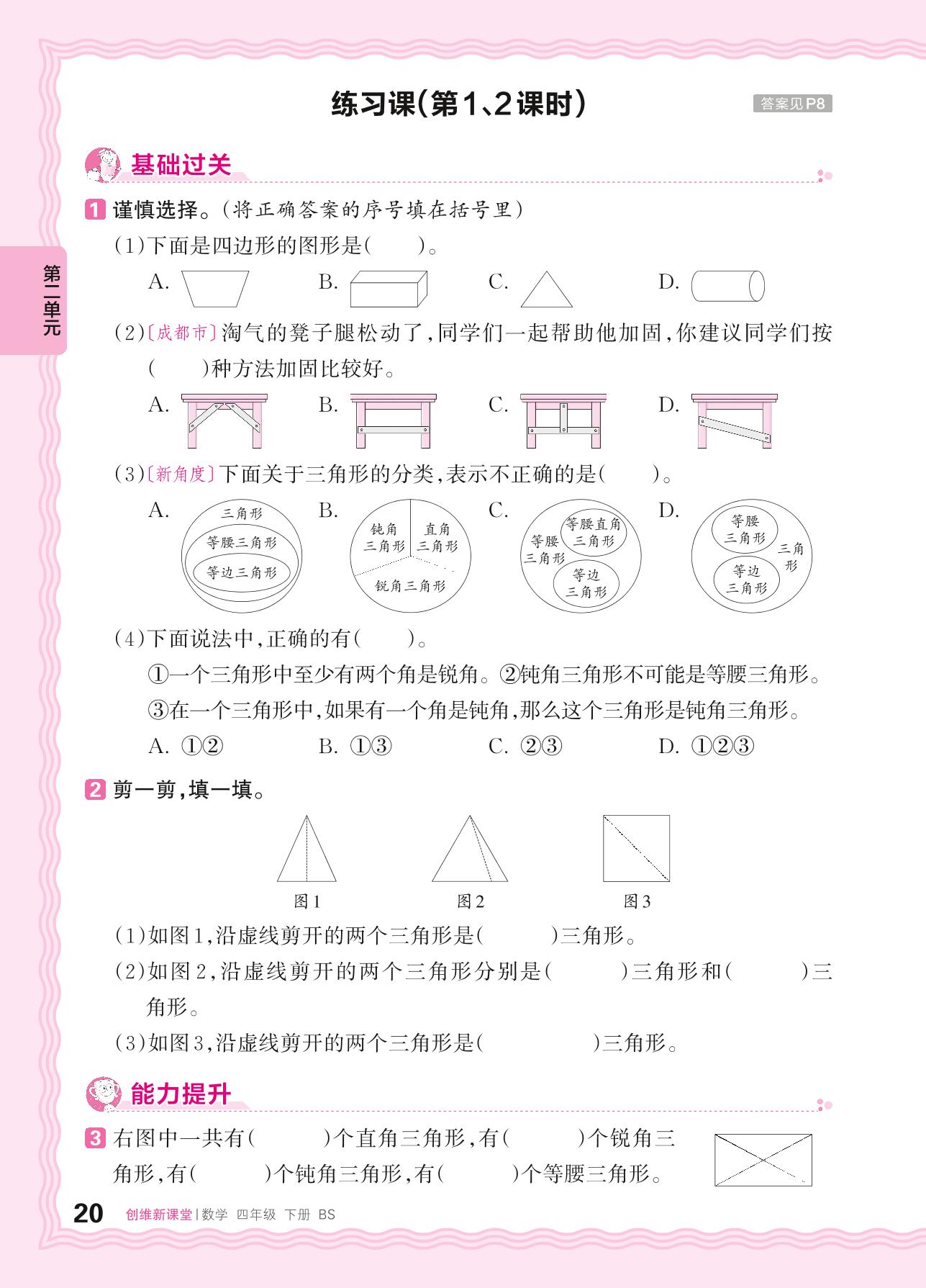 2024春下册四年级数学北师版 第二单元 认识三角形和四边形——图形分类、三角形分类练习课