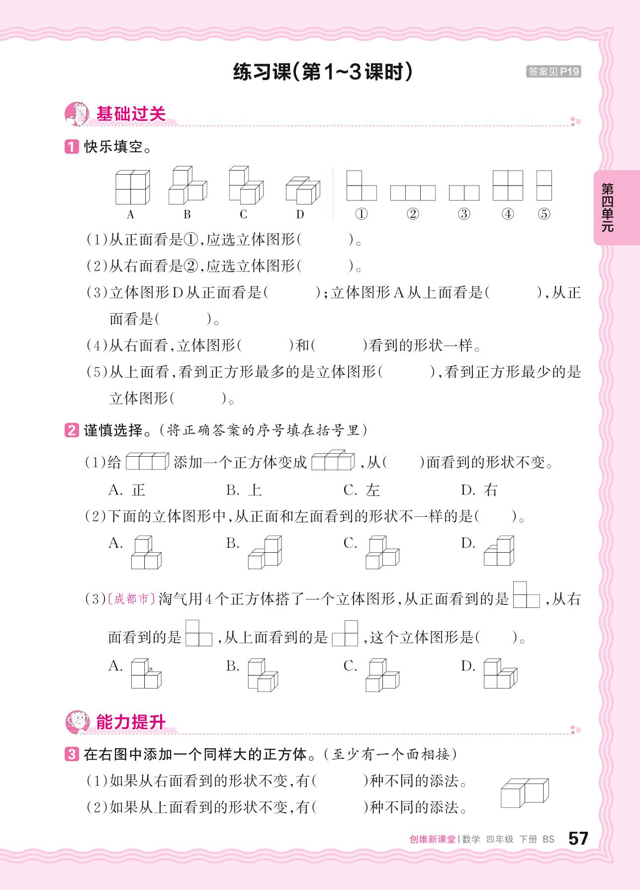 2024春下册四年级数学北师版 第四单元观察物体练习课