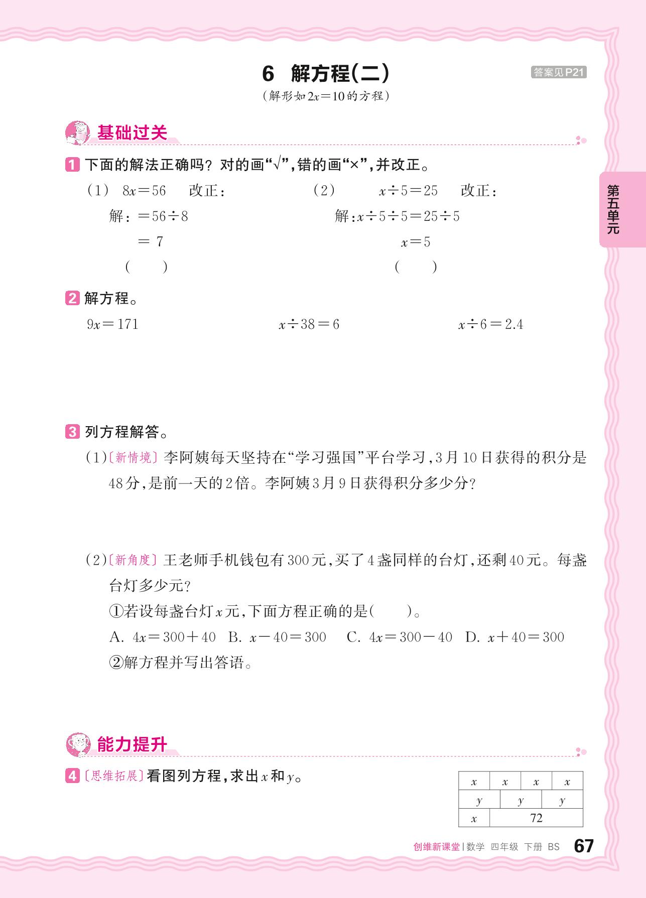 2024春下册四年级数学北师版 第五单元 认识方程——6. 解方程(二)