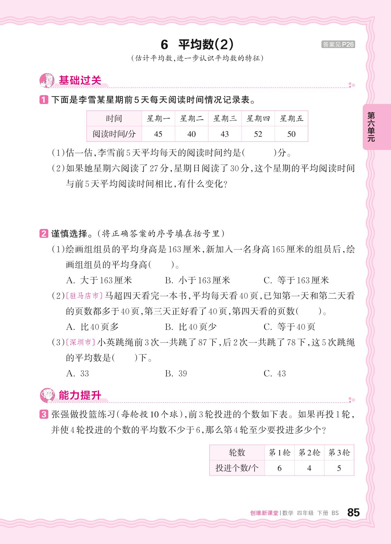 2024春下册四年级数学北师版 第六单元 数据的表示和分析——6. 平均数(2)