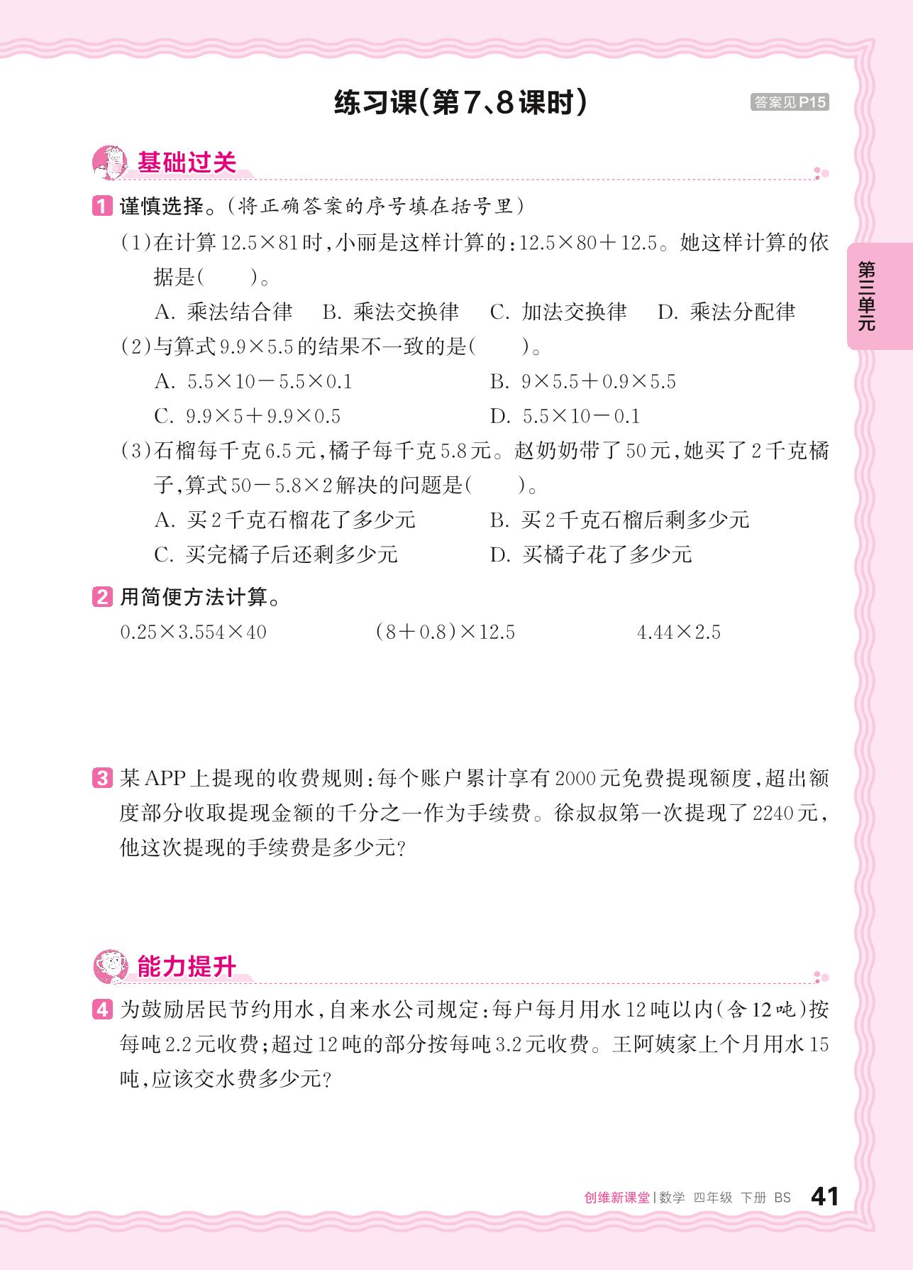 2024春下册四年级数学北师版 第三单元 小数乘法——手拉手练习课